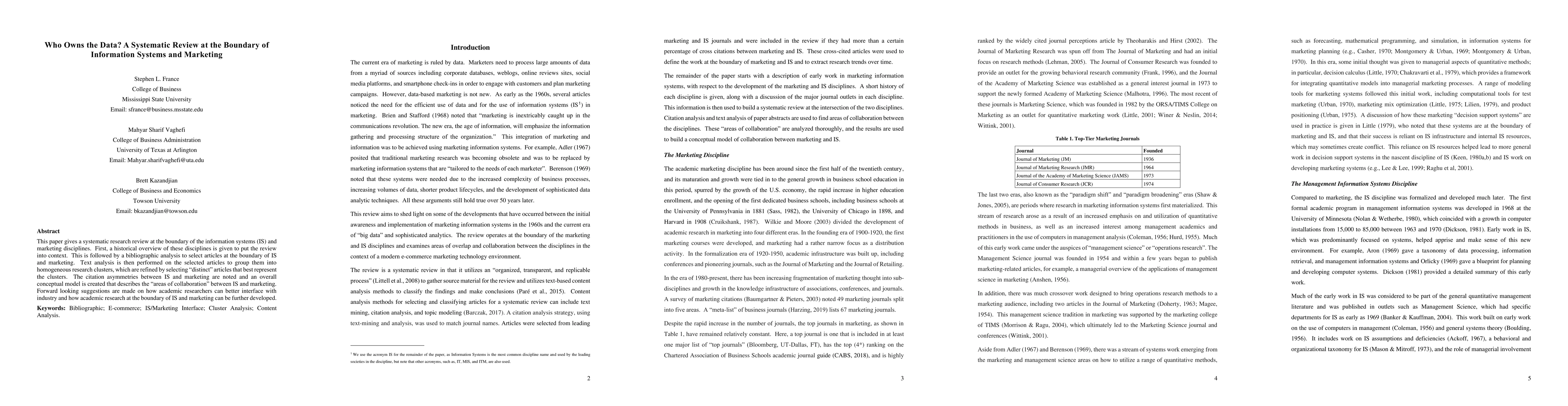 This paper systematically reviews research at the intersection of information systems and marketing, identifying key clusters and noting citation asymmetries. It proposes a conceptual model for collaboration and suggests ways to enhance academic-industry interaction and future research development.