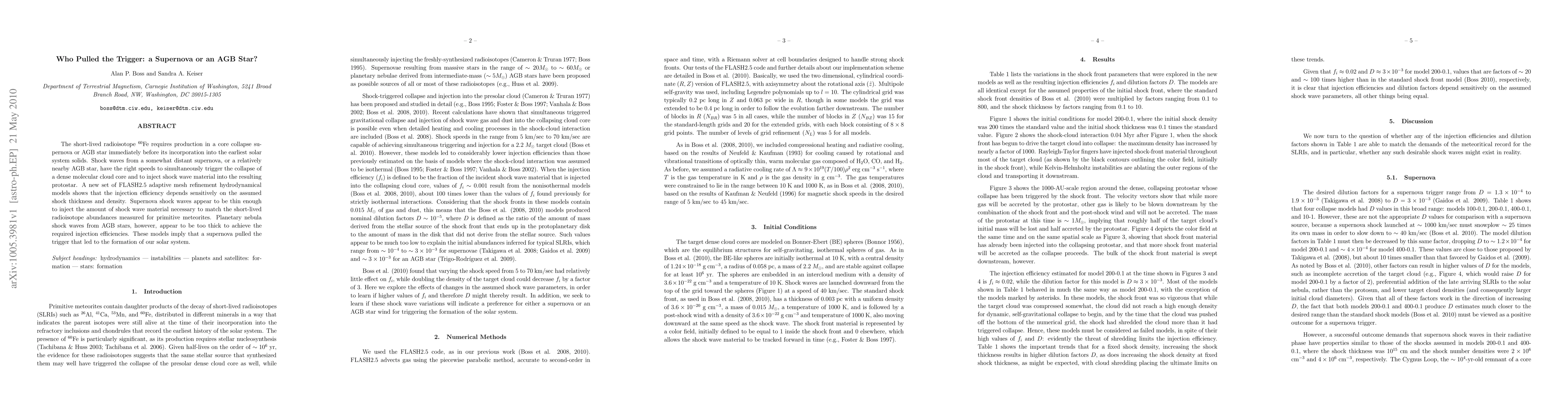 The short-lived radioisotope $^{60}$Fe requires production in a core collapse supernova or AGB star immediately before its incorporation into the earliest solar system solids. Shock waves from a somewhat distant supernova, or a relatively nearby AGB star, have the right speeds to simultaneously trigger the collapse of a dense molecular cloud core and to inject shock wave material into the resulting protostar. A new set of FLASH2.5 adaptive mesh refinement hydrodynamical models shows that the injection efficiency depends sensitively on the assumed shock thickness and density. Supernova shock waves appear to be thin enough to inject the amount of shock wave material necessary to match the short-lived radioisotope abundances measured for primitive meteorites. Planetary nebula shock waves from AGB stars, however, appear to be too thick to achieve the required injection efficiencies. These models imply that a supernova pulled the trigger that led to the formation of our solar system.