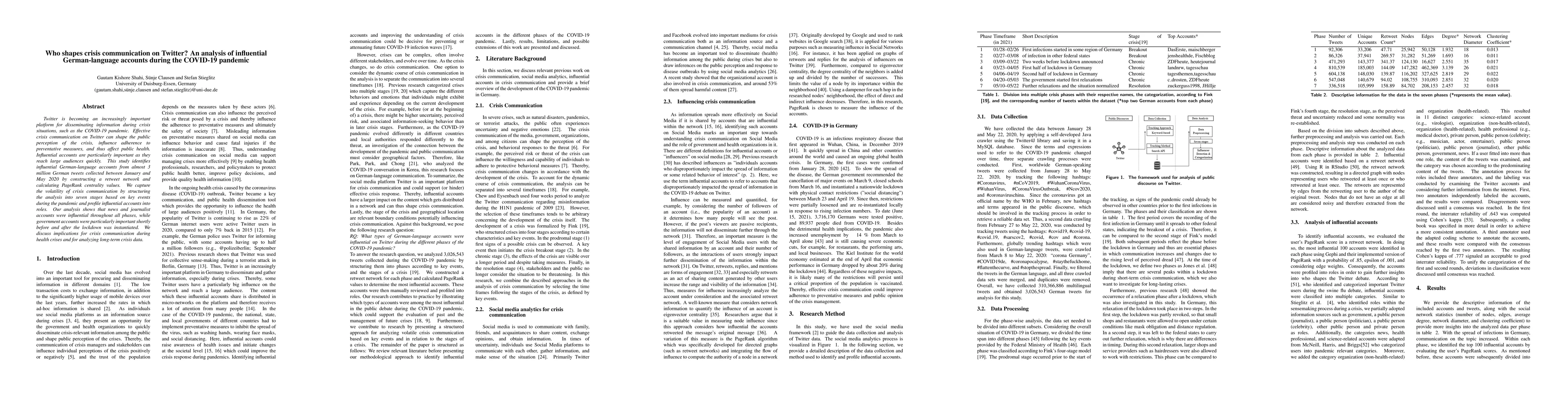 Twitter is becoming an increasingly important platform for disseminating information during crisis situations, such as the COVID-19 pandemic. Effective crisis communication on Twitter can shape the public perception of the crisis, influence adherence to preventative measures, and thus affect public health. Influential accounts are particularly important as they reach large audiences quickly. This study identifies influential German-language accounts from almost 3 million German tweets collected between January and May 2020 by constructing a retweet network and calculating PageRank centrality values. We capture the volatility of crisis communication by structuring the analysis into seven stages based on key events during the pandemic and profile influential accounts into roles. Our analysis shows that news and journalist accounts were influential throughout all phases, while government accounts were particularly important shortly before and after the lockdown was instantiated. We discuss implications for crisis communication during health crises and for analyzing long-term crisis data.