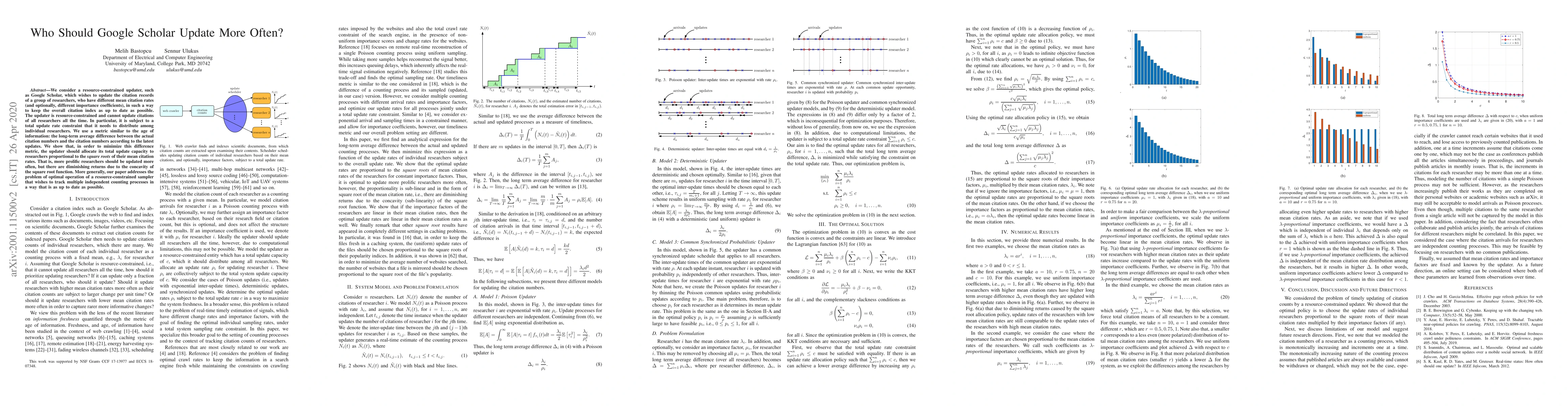 We consider a resource-constrained updater, such as Google Scholar, which wishes to update the citation records of a group of researchers, who have different mean citation rates (and optionally, different importance coefficients), in such a way to keep the overall citation index as up to date as possible. The updater is resource-constrained and cannot update citations of all researchers all the time. In particular, it is subject to a total update rate constraint that it needs to distribute among individual researchers. We use a metric similar to the age of information: the long-term average difference between the actual citation numbers and the citation numbers according to the latest updates. We show that, in order to minimize this difference metric, the updater should allocate its total update capacity to researchers proportional to the $square$ $roots$ of their mean citation rates. That is, more prolific researchers should be updated more often, but there are diminishing returns due to the concavity of the square root function. More generally, our paper addresses the problem of optimal operation of a resource-constrained sampler that wishes to track multiple independent counting processes in a way that is as up to date as possible.