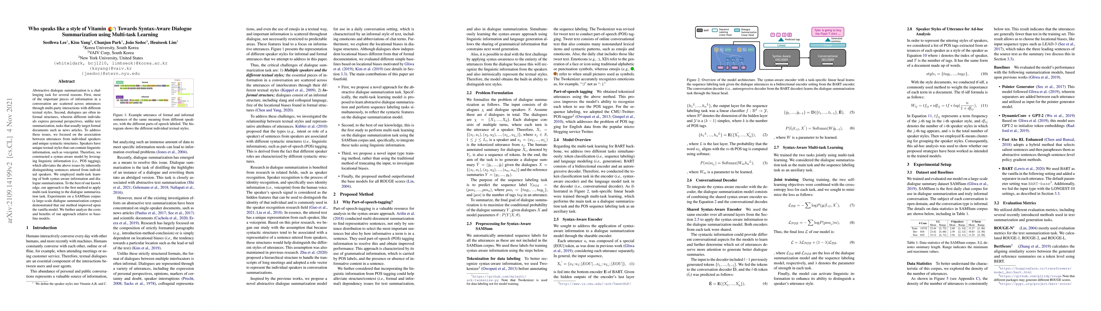 This paper proposes a syntax-aware model for abstractive dialogue summarization that leverages unique syntactic structures and speaker styles, employing multi-task learning to improve summarization of informal multi-party dialogues. Experimental results on the SAMSum corpus show enhanced performance compared to baseline models.