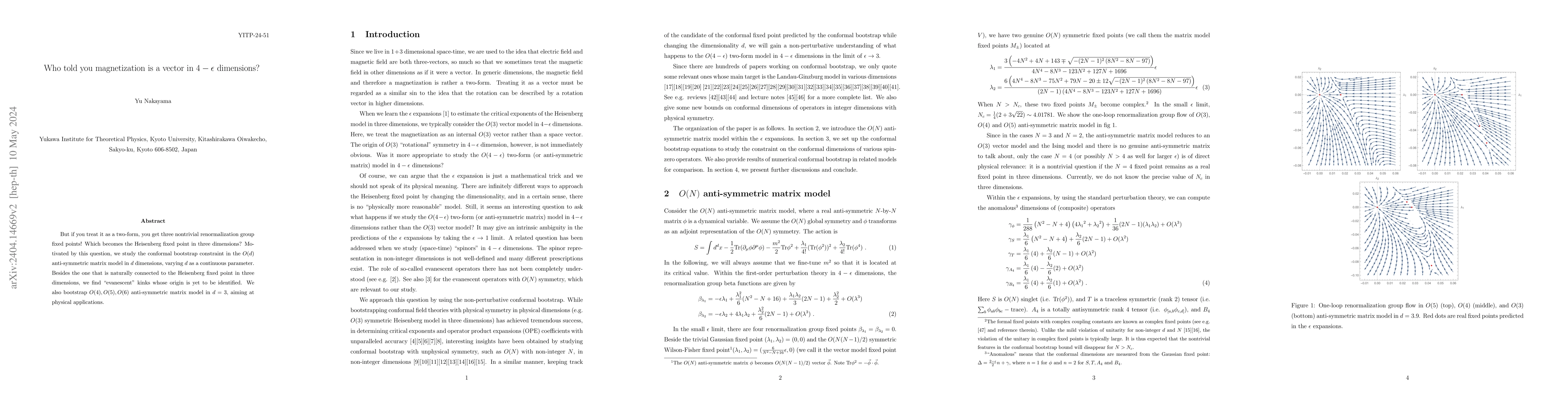 But if you treat it as a two-form, you get three nontrivial renormalization group fixed points! Which becomes the Heisenberg fixed point in three dimensions? Motivated by this question, we study the conformal bootstrap constraint in the $O(d)$ anti-symmetric matrix model in $d$ dimensions, varying $d$ as a continuous parameter. Besides the one that is naturally connected to the Heisenberg fixed point in three dimensions, we find "evanescent" kinks whose origin is yet to be identified. We also bootstrap $O(4), O(5), O(6)$ anti-symmetric matrix model in $d=3$, aiming at physical applications.