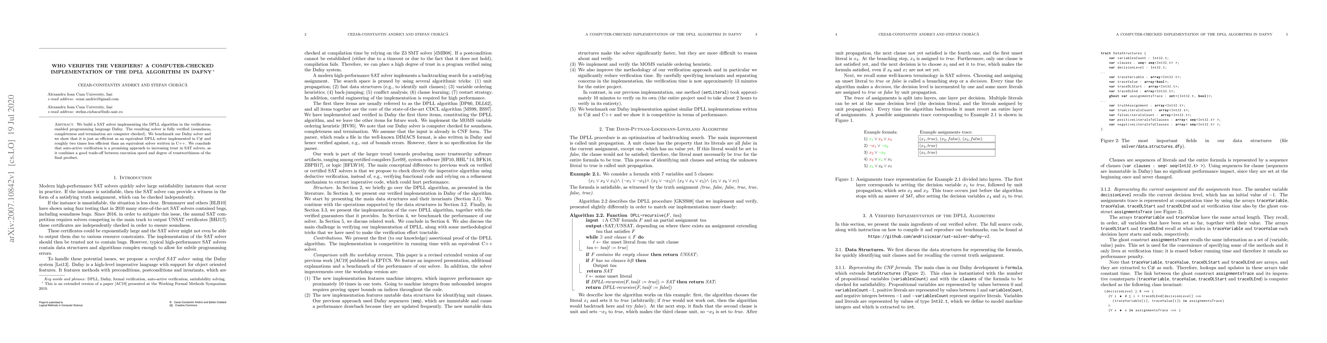 This paper presents a verified SAT solver implementing the DPLL algorithm in Dafny, ensuring soundness, completeness, and termination through computer checks. Benchmarks show it matches the efficiency of a C# DPLL solver but is about twice slower than a C++ counterpart, suggesting auto-active verification offers a balanced trust-speed trade-off.
