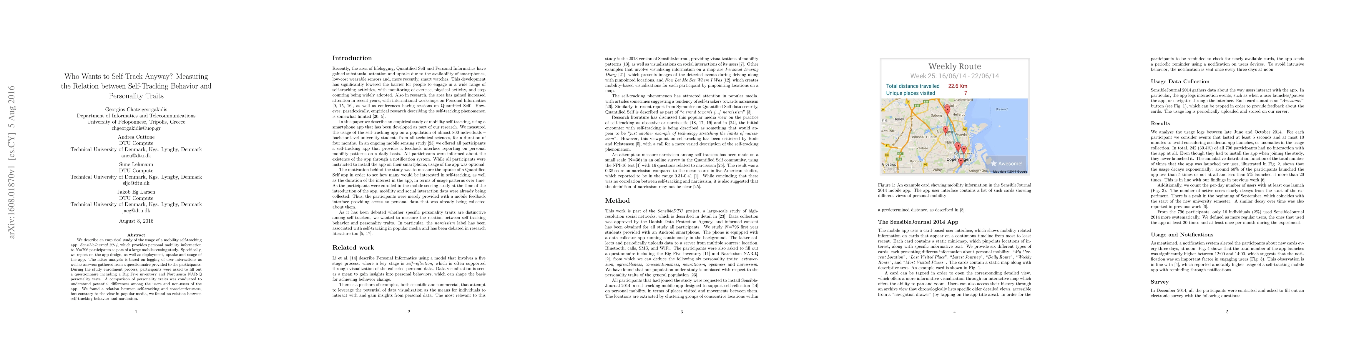 We describe an empirical study of the usage of a mobility self-tracking app, SensibleJournal 2014, which provides personal mobility information to N=796 participants as part of a large mobile sensing study. Specifically, we report on the app design, as well as deployment, uptake and usage of the app. The latter analysis is based on logging of user interactions as well as answers gathered from a questionnaire provided to the participants. During the study enrollment process, participants were asked to fill out a questionnaire including a Big Five inventory and Narcissism NAR-Q personality tests. A comparison of personality traits was conducted to understand potential differences among the users and non-users of the app. We found a relation between self-tracking and conscientiousness, but contrary to the view in popular media, we found no relation between self-tracking behavior and narcissism.