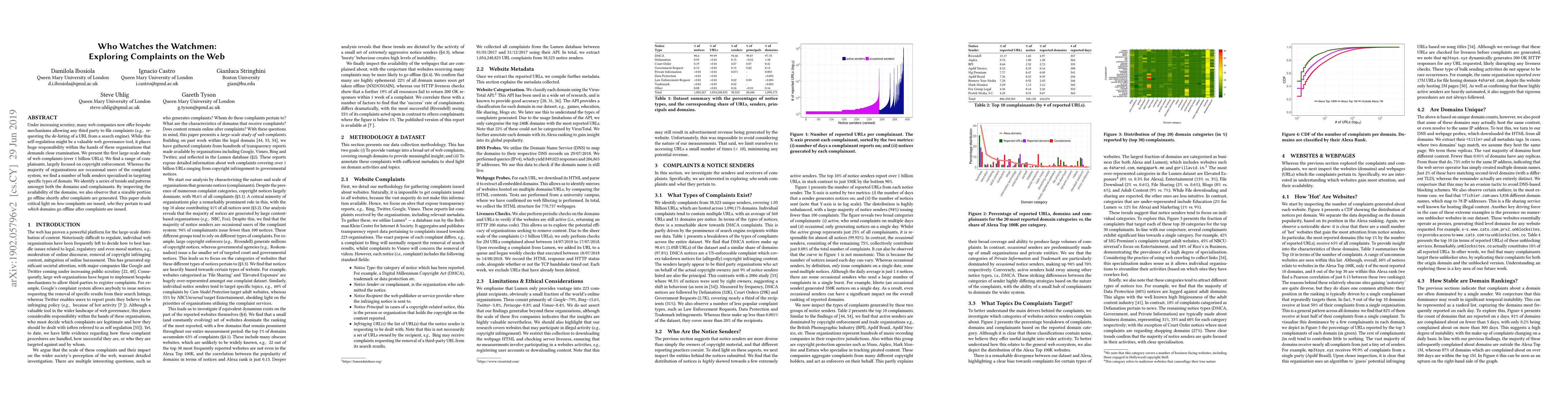 Under increasing scrutiny, many web companies now offer bespoke mechanisms allowing any third party to file complaints (e.g., requesting the de-listing of a URL from a search engine). While this self-regulation might be a valuable web governance tool, it places huge responsibility within the hands of these organisations that demands close examination. We present the first large-scale study of web complaints (over 1 billion URLs). We find a range of complainants, largely focused on copyright enforcement. Whereas the majority of organisations are occasional users of the complaint system, we find a number of bulk senders specialised in targeting specific types of domain. We identify a series of trends and patterns amongst both the domains and complainants. By inspecting the availability of the domains, we also observe that a sizeable portion go offline shortly after complaints are generated. This paper sheds critical light on how complaints are issued, who they pertain to and which domains go offline after complaints are issued.