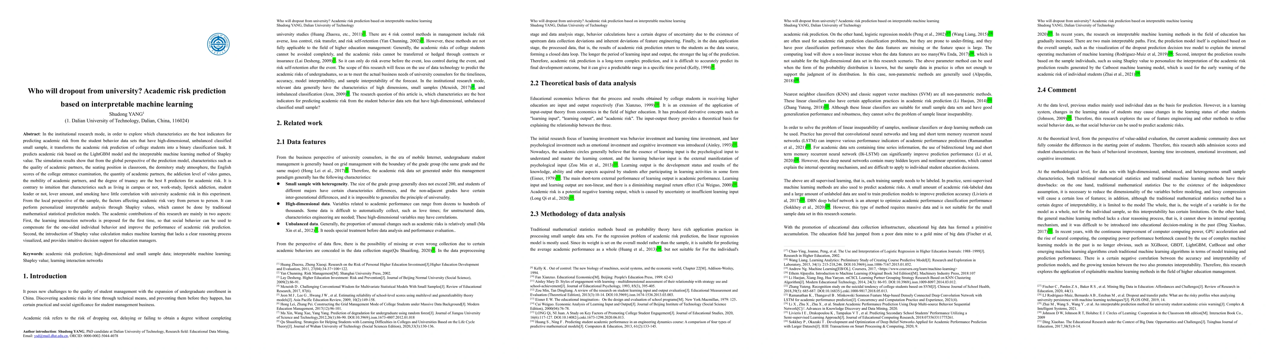This research uses interpretable machine learning to predict university dropout risk based on student behavior data, employing the LightGBM model and Shapley values for analysis. Key predictors identified include academic partner quality and truancy, while factors like living on campus show little correlation. The study introduces learning interaction networks and Shapley values for personalized, interpretable predictions.