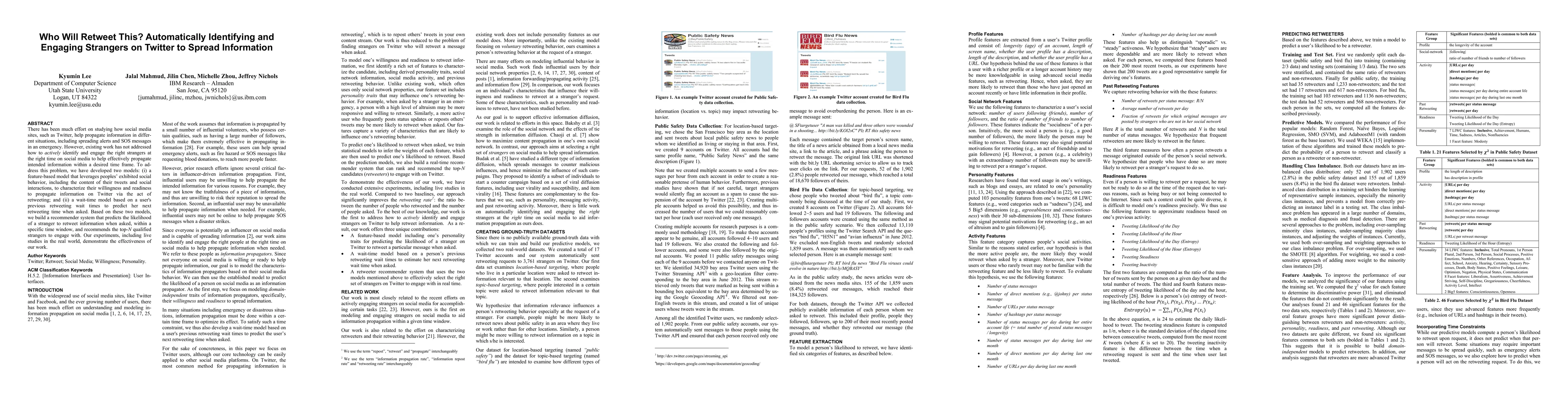 This paper develops two models to predict and engage strangers on Twitter to effectively spread information. The feature-based model characterizes users' retweeting behavior, while the wait-time model predicts future retweeting times. The recommender system identifies top-N users likely to retweet within a specific time frame, validated through real-world experiments.