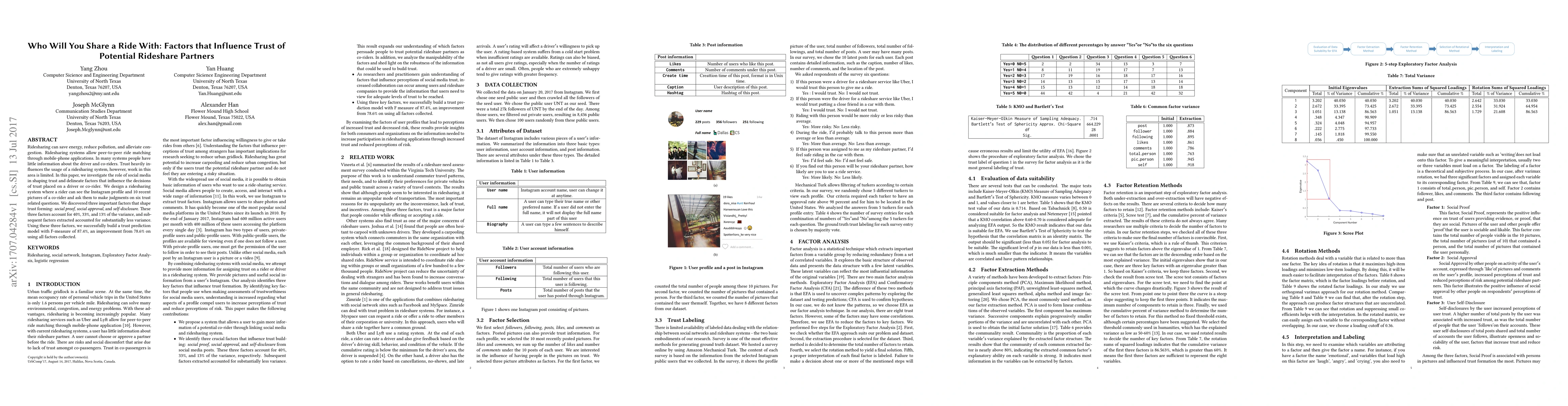 Ridesharing can save energy, reduce pollution, and alleviate congestion. Ridesharing systems allow peer-to-peer ride matching through mobile-phone applications. In many systems people have little information about the driver and co-riders. Trust heavily influences the usage of a ridesharing system, however, work in this area is limited. In this paper, we investigate the role of social media in shaping trust and delineate factors that influence the decisions of trust placed on a driver or co-rider. We design a ridesharing system where a rider can see the Instagram profile and 10 recent pictures of a co-rider and ask them to make judgments on six trust related questions. We discovered three important factors that shape trust forming: \textit{social proof}, \textit{social approval}, and \textit{self-disclosure}. These three factors account for 40\%, 33\%, and 13\% of the variance, and subsequent factors extracted accounted for substantially less variance. Using these three factors, we successfully build a trust prediction model with F-measure of 87.4\%, an improvement from 78.6\% on using all factors collected.