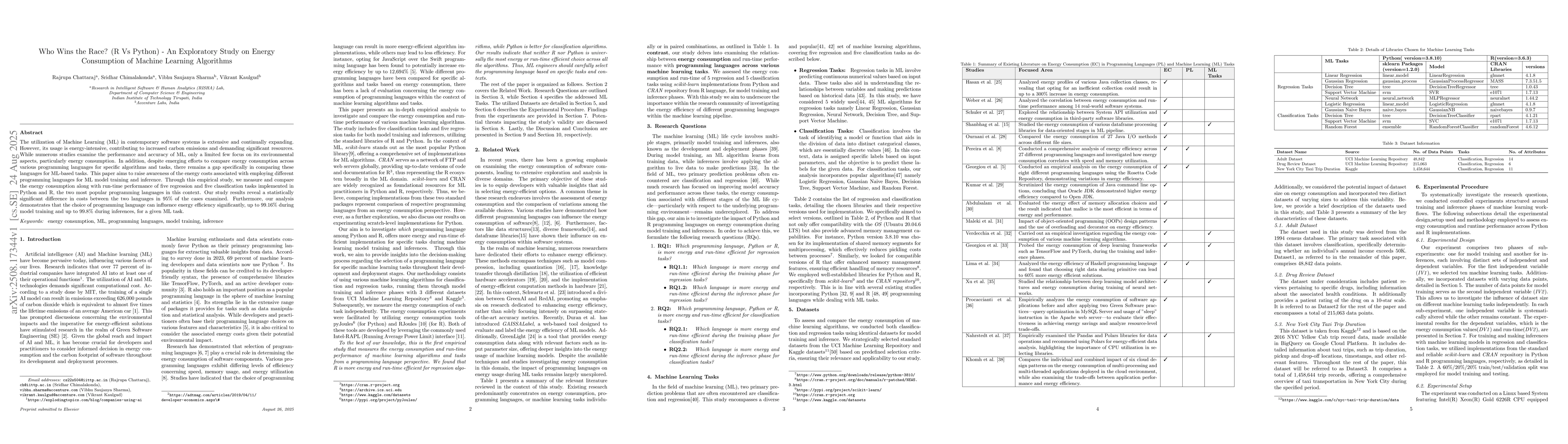 The utilization of Machine Learning (ML) in contemporary software systems is extensive and continually expanding. However, its usage is energy-intensive, contributing to increased carbon emissions and demanding significant resources. While numerous studies examine the performance and accuracy of ML, only a limited few focus on its environmental aspects, particularly energy consumption. In addition, despite emerging efforts to compare energy consumption across various programming languages for specific algorithms and tasks, there remains a gap specifically in comparing these languages for ML-based tasks. This paper aims to raise awareness of the energy costs associated with employing different programming languages for ML model training and inference. Through this empirical study, we measure and compare the energy consumption along with run-time performance of five regression and five classification tasks implemented in Python and R, the two most popular programming languages in this context. Our study results reveal a statistically significant difference in costs between the two languages in 95% of the cases examined. Furthermore, our analysis demonstrates that the choice of programming language can influence energy efficiency significantly, up to 99.16% during model training and up to 99.8% during inferences, for a given ML task.