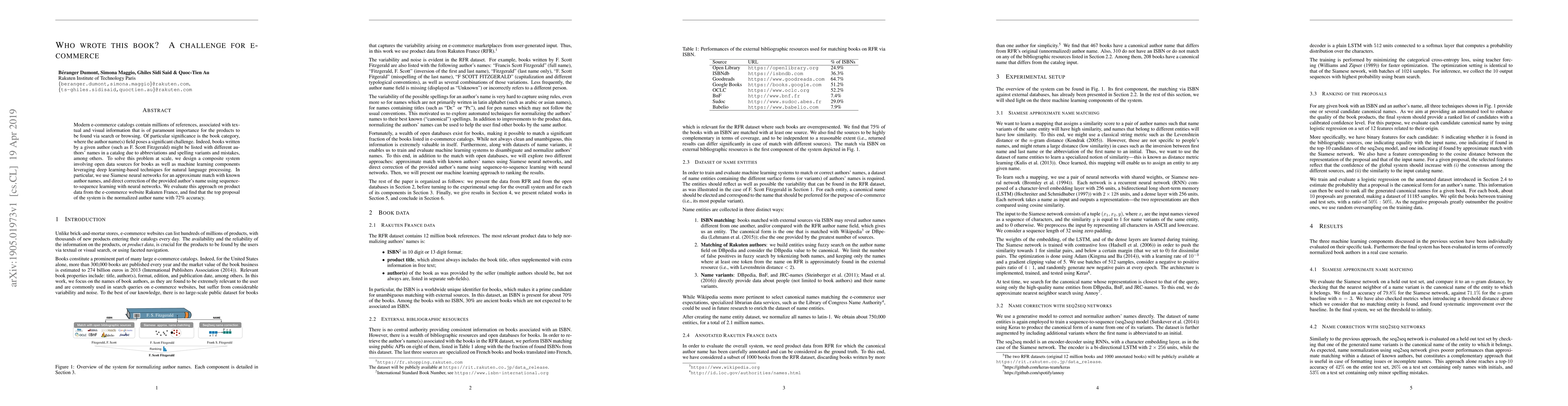 Modern e-commerce catalogs contain millions of references, associated with textual and visual information that is of paramount importance for the products to be found via search or browsing. Of particular significance is the book category, where the author name(s) field poses a significant challenge. Indeed, books written by a given author (such as F. Scott Fitzgerald) might be listed with different authors' names in a catalog due to abbreviations and spelling variants and mistakes, among others. To solve this problem at scale, we design a composite system involving open data sources for books as well as machine learning components leveraging deep learning-based techniques for natural language processing. In particular, we use Siamese neural networks for an approximate match with known author names, and direct correction of the provided author's name using sequence-to-sequence learning with neural networks. We evaluate this approach on product data from the e-commerce website Rakuten France, and find that the top proposal of the system is the normalized author name with 72% accuracy.