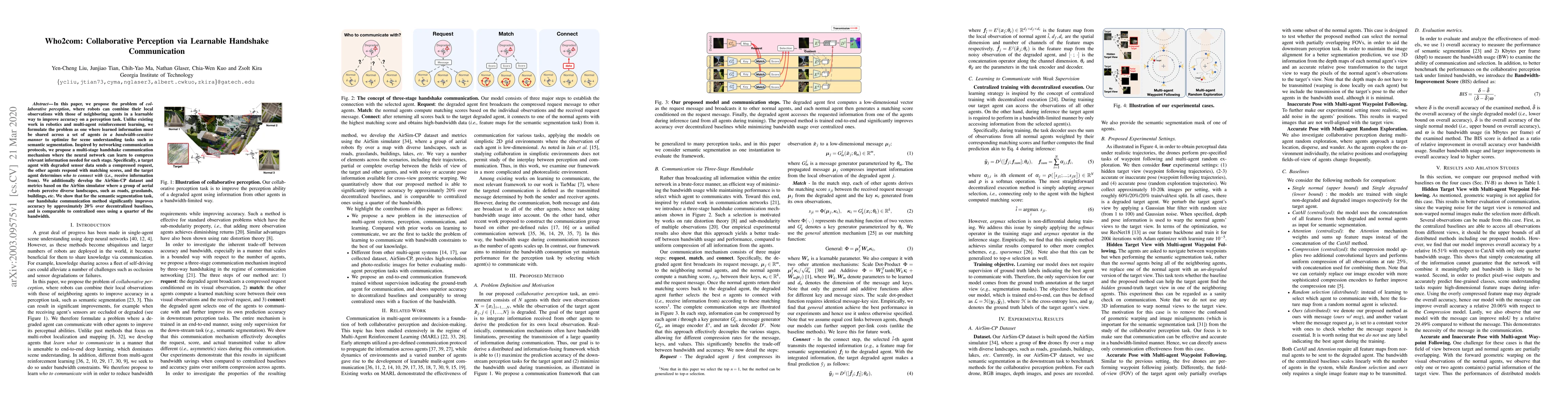This paper introduces a collaborative perception framework called Who2com, which enables robots to enhance perception accuracy through learnable handshake communication. The proposed multi-stage mechanism significantly improves semantic segmentation accuracy by 20% over decentralized baselines, using a fraction of the bandwidth.