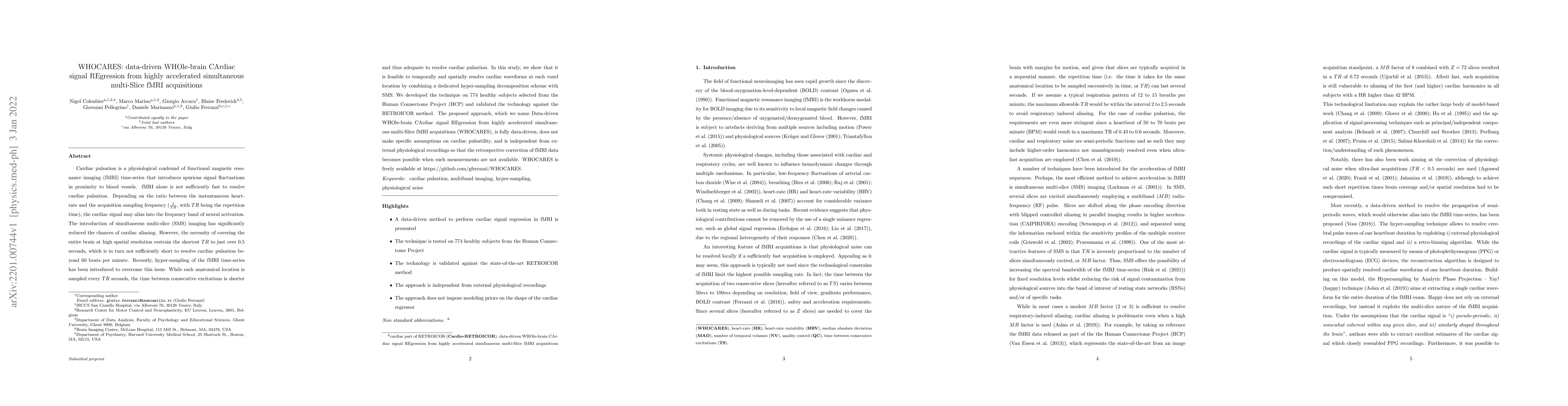Cardiac pulsation is a physiological confound of functional magnetic resonance imaging (fMRI) time-series that introduces spurious signal fluctuations in proximity to blood vessels. fMRI alone is not sufficiently fast to resolve cardiac pulsation. Depending on the ratio between the instantaneous heart-rate and the acquisition sampling frequency (1/TR, with TR being the repetition time), the cardiac signal may alias into the frequency band of neural activation. The introduction of simultaneous multi-slice (SMS) imaging has significantly reduced the chances of cardiac aliasing. However, the necessity of covering the entire brain at high spatial resolution restrain the shortest TR to just over 0.5 seconds, which is in turn not sufficiently short to resolve cardiac pulsation beyond 60 beats per minute. Recently, hyper-sampling of the fMRI time-series has been introduced to overcome this issue. While each anatomical location is sampled every TR seconds, the time between consecutive excitations is shorter and thus adequate to resolve cardiac pulsation. In this study, we show that it is feasible to temporally and spatially resolve cardiac waveforms at each voxel location by combining a dedicated hyper-sampling decomposition scheme with SMS. We developed the technique on 774 healthy subjects selected from the Human Connectome Project (HCP) and validated the technology against the RETROICOR method. The proposed approach, which we name Data-driven WHOle-brain CArdiac signal REgression from highly accelerated simultaneous multi-Slice fMRI acquisitions (WHOCARES), is fully data-driven, does not make specific assumptions on cardiac pulsatility, and is independent from external physiological recordings so that the retrospective correction of fMRI data becomes possible when such measurements are not available. WHOCARES is freely available at https://github.com/gferrazzi/WHOCARES.