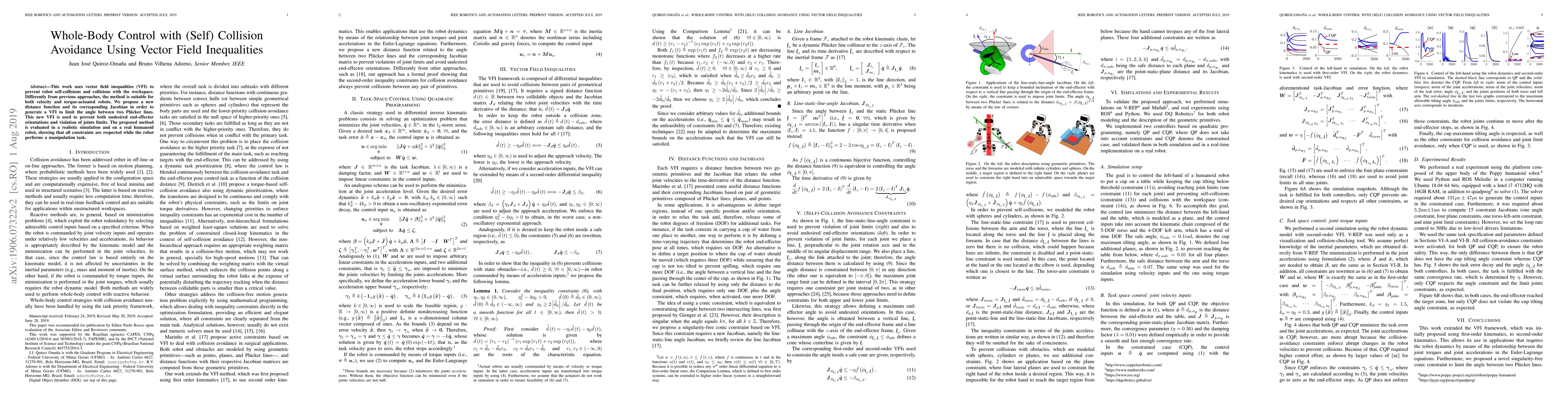 This work uses vector field inequalities (VFI) to prevent robot self-collisions and collisions with the workspace. Differently from previous approaches, the method is suitable for both velocity and torque-actuated robots. We propose a new distance function and its corresponding Jacobian in order to generate a VFI to limit the angle between two Pl\"ucker lines. This new VFI is used to prevent both undesired end-effector orientations and violation of joints limits. The proposed method is evaluated in a realistic simulation and on a real humanoid robot, showing that all constraints are respected while the robot performs a manipulation task.