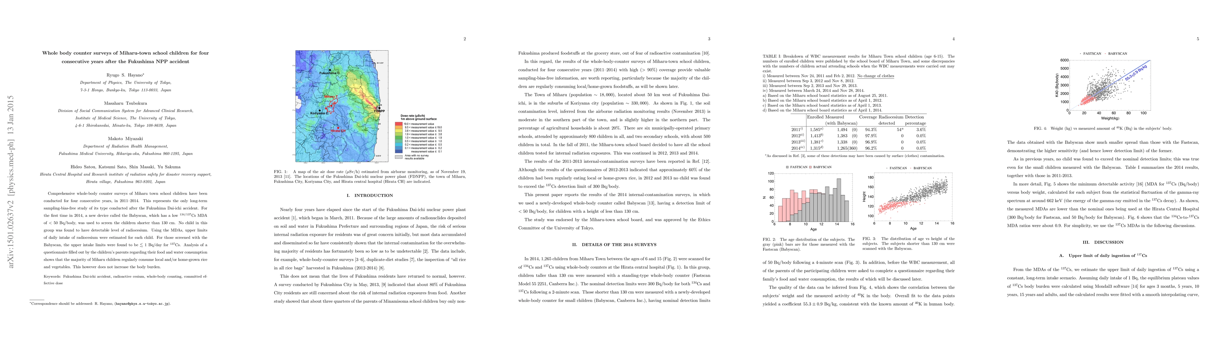 Comprehensive whole-body counter surveys of Miharu town school children have been conducted for four consecutive years, in 2011-2014. This represents the only long-term sampling-bias-free study of its type conducted after the Fukushima Dai-ichi accident. For the first time in 2014, a new device called the Babyscan, which has a low $^{134/137}$Cs MDA of $< 50$ Bq/body, was used to screen the children shorter than 130 cm. No child in this group was found to have detectable level of radiocesium. Using the MDAs, upper limits of daily intake of radiocesium were estimated for each child. For those screened with the Babyscan, the upper intake limits were found to be <1 Bq/day for $^{137}$Cs. Analysis of a questionnaire filled out by the children's parents regarding their food and water consumption shows that the majority of Miharu children regularly consume local and/or home-grown rice and vegetables. This however does not increase the body burden.