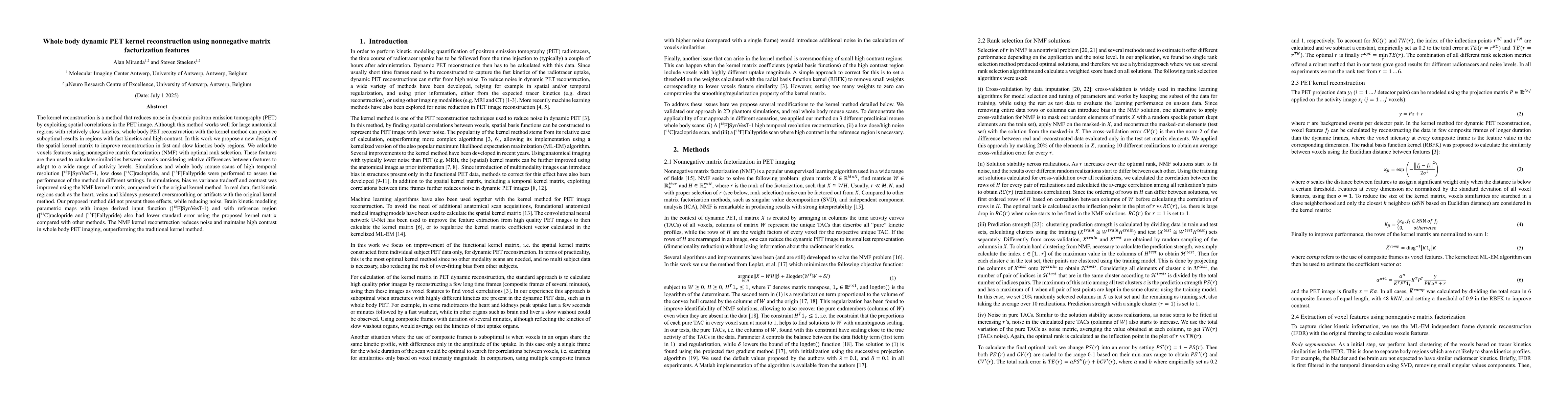 The kernel reconstruction is a method that reduces noise in dynamic positron emission tomography (PET) by exploiting spatial correlations in the PET image. Although this method works well for large anatomical regions with relatively slow kinetics, whole body PET reconstruction with the kernel method can produce suboptimal results in regions with fast kinetics and high contrast. In this work we propose a new design of the spatial kernel matrix to improve reconstruction in fast and slow kinetics body regions. We calculate voxels features using nonnegative matrix factorization (NMF) with optimal rank selection. These features are then used to calculate similarities between voxels considering relative differences between features to adapt to a wide range of activity levels. Simulations and whole body mouse scans of high temporal resolution [18F]SynVesT-1, low dose [11C]raclopride, and [18F]Fallypride were performed to assess the performance of the method in different settings. In simulations, bias vs variance tradeoff and contrast was improved using the NMF kernel matrix, compared with the original kernel method. In real data, fast kinetic regions such as the heart, veins and kidneys presented oversmoothing or artifacts with the original kernel method. Our proposed method did not present these effects, while reducing noise. Brain kinetic modeling parametric maps with image derived input function ([18F]SynVesT-1) and with reference region ([11C]raclopride and [18F]Fallypride) also had lower standard error using the proposed kernel matrix compared with other methods. The NMF kernel reconstruction reduces noise and maintains high contrast in whole body PET imaging, outperforming the traditional kernel method.