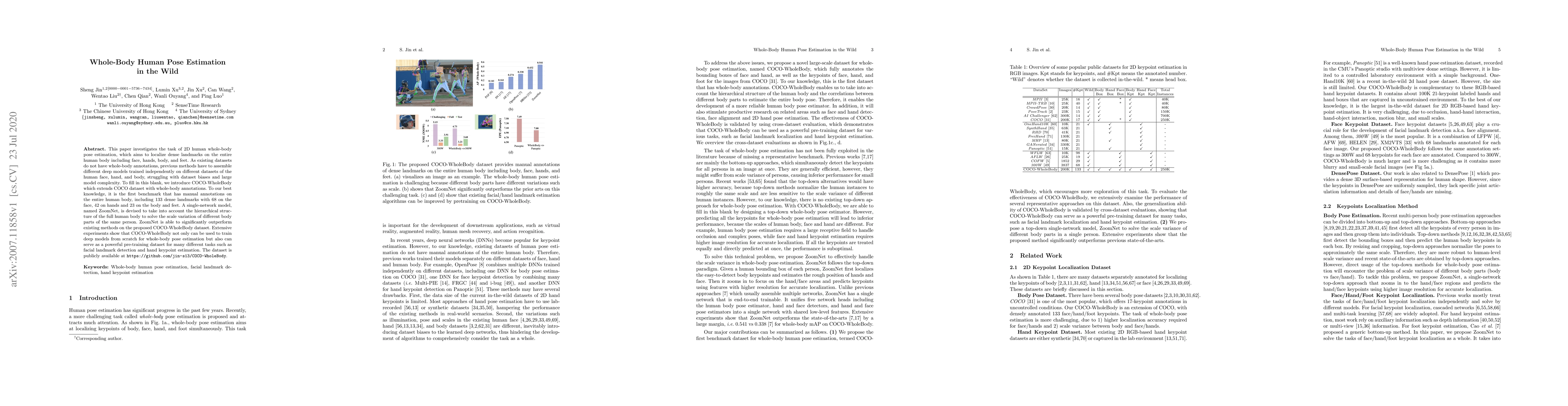 This paper introduces COCO-WholeBody, a new dataset extending COCO with whole-body annotations, including 133 dense landmarks. It presents ZoomNet, a single-network model that outperforms existing methods by addressing scale variations in human body parts.