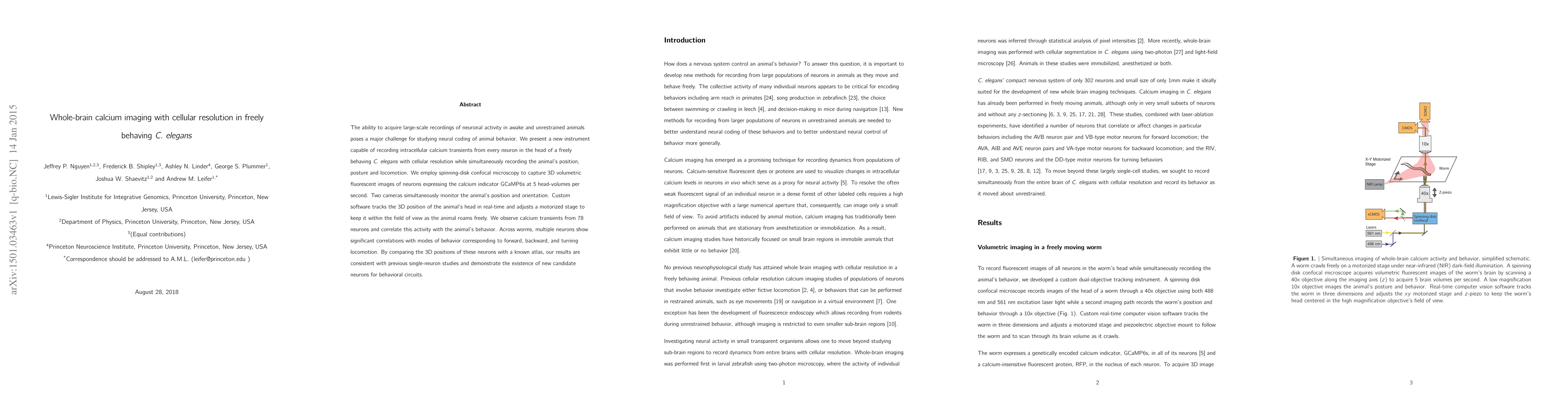 This paper introduces a novel instrument for whole-brain calcium imaging in freely behaving C. elegans, achieving cellular resolution and correlating neuronal activity with animal behavior. The method uses spinning-disk confocal microscopy and custom software to track and record 3D neuronal activity and animal movement simultaneously.