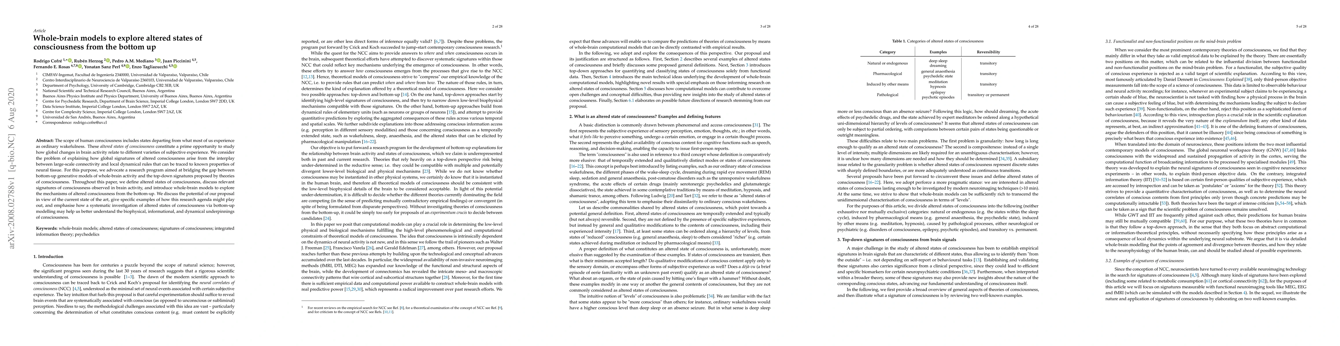 The scope of human consciousness includes states departing from what most of us experience as ordinary wakefulness. These altered states of consciousness constitute a prime opportunity to study how global changes in brain activity relate to different varieties of subjective experience. We consider the problem of explaining how global signatures of altered consciousness arise from the interplay between large-scale connectivity and local dynamical rules that can be traced to known properties of neural tissue. For this purpose, we advocate a research program aimed at bridging the gap between bottom-up generative models of whole-brain activity and the top-down signatures proposed by theories of consciousness. Throughout this paper, we define altered states of consciousness, discuss relevant signatures of consciousness observed in brain activity, and introduce whole-brain models to explore the mechanisms of altered consciousness from the bottom-up. We discuss the potential of our proposal in view of the current state of the art, give specific examples of how this research agenda might play out, and emphasise how a systematic investigation of altered states of consciousness via bottom-up modelling may help us better understand the biophysical, informational, and dynamical underpinnings of consciousness.