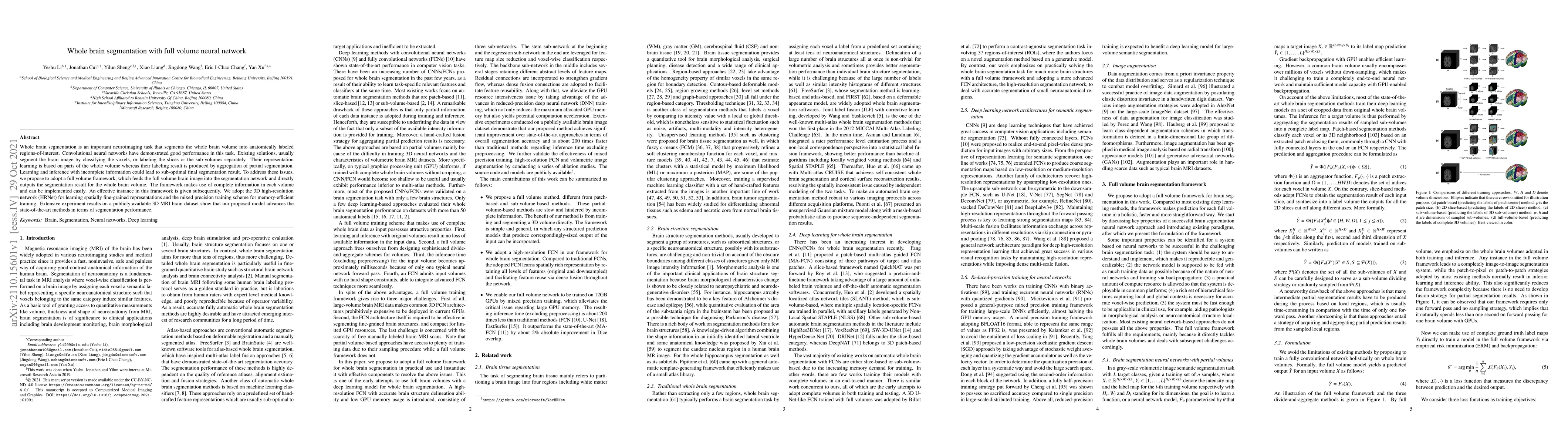 This paper proposes a new whole brain segmentation framework that uses a full volume neural network to produce more accurate segmentations than existing methods. It achieves state-of-the-art performance on a publicly available MRI dataset using a 3D high-resolution network and mixed precision training scheme.