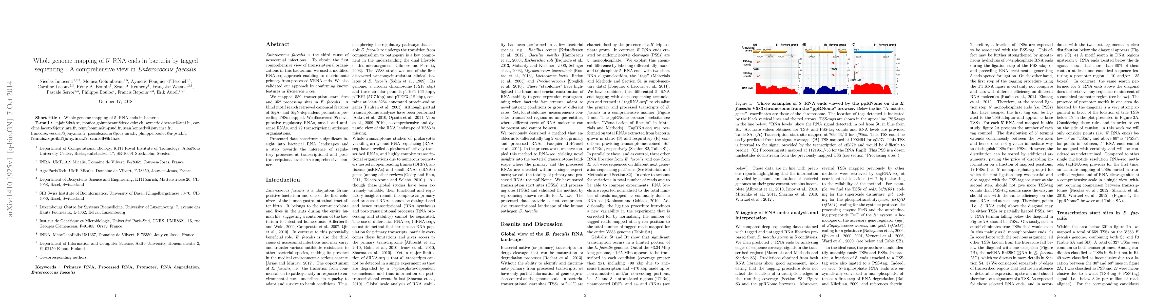 Enterococcus faecalis is the third cause of nosocomial infections. To obtain the first comprehensive view of transcriptional organizations in this bacterium, we used a modified RNA-seq approach enabling to discriminate primary from processed 5'RNA ends. We also validated our approach by confirming known features in Escherichia coli. We mapped 559 transcription start sites and 352 processing sites in E. faecalis. A blind motif search retrieved canonical features of SigA- and SigN-dependent promoters preceding TSSs mapped. We discovered 95 novel putative regulatory RNAs, small- and antisense RNAs, and 72 transcriptional antisense organisations. Presented data constitute a significant insight into bacterial RNA landscapes and a step towards the inference of regulatory processes at transcriptional and post-transcriptional levels in a comprehensive manner.