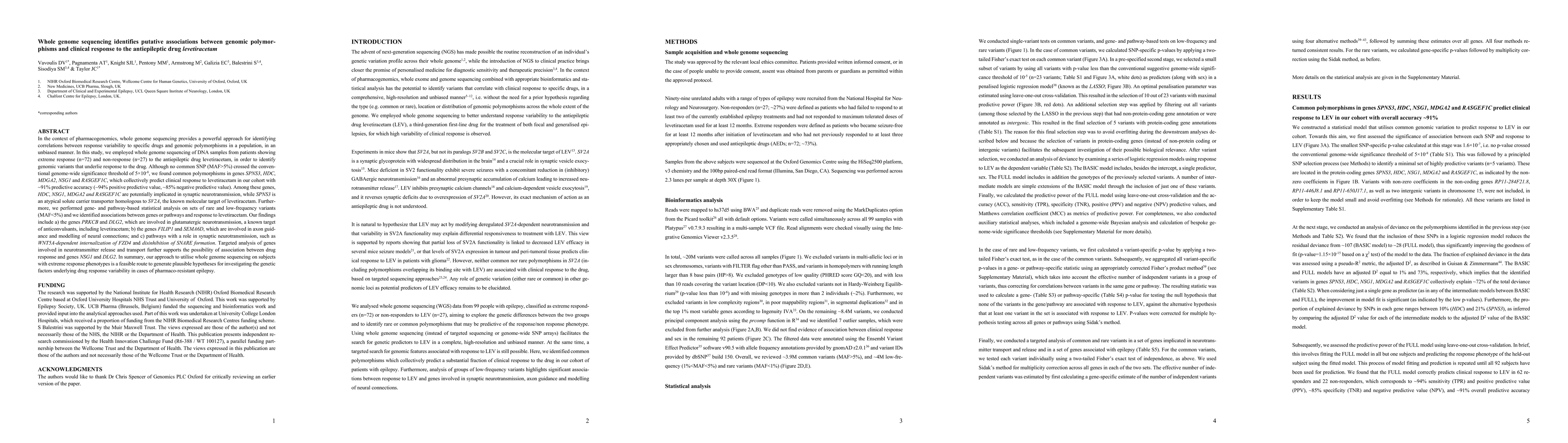 This study uses whole genome sequencing to identify genomic polymorphisms associated with clinical response to levetiracetam in patients, finding common variants in SPNS3, HDC, MDGA2, NSG1, and RASGEF1C, and rare variants in PRKCB, DLG2, FILIP1, SEMA6D, and synaptic pathways, suggesting genetic factors influencing drug response in epilepsy.