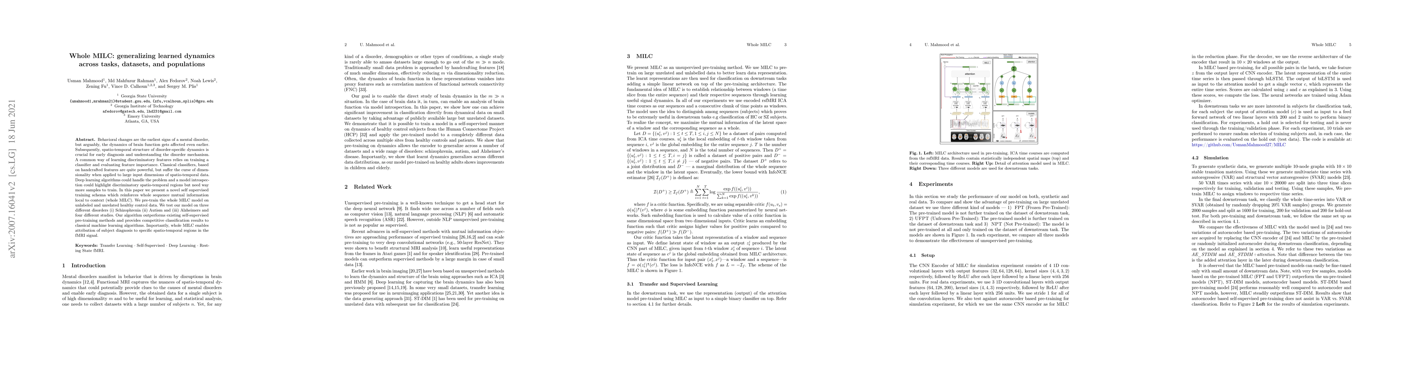 Behavioral changes are the earliest signs of a mental disorder, but arguably, the dynamics of brain function gets affected even earlier. Subsequently, spatio-temporal structure of disorder-specific dynamics is crucial for early diagnosis and understanding the disorder mechanism. A common way of learning discriminatory features relies on training a classifier and evaluating feature importance. Classical classifiers, based on handcrafted features are quite powerful, but suffer the curse of dimensionality when applied to large input dimensions of spatio-temporal data. Deep learning algorithms could handle the problem and a model introspection could highlight discriminatory spatio-temporal regions but need way more samples to train. In this paper we present a novel self supervised training schema which reinforces whole sequence mutual information local to context (whole MILC). We pre-train the whole MILC model on unlabeled and unrelated healthy control data. We test our model on three different disorders (i) Schizophrenia (ii) Autism and (iii) Alzheimers and four different studies. Our algorithm outperforms existing self-supervised pre-training methods and provides competitive classification results to classical machine learning algorithms. Importantly, whole MILC enables attribution of subject diagnosis to specific spatio-temporal regions in the fMRI signal.