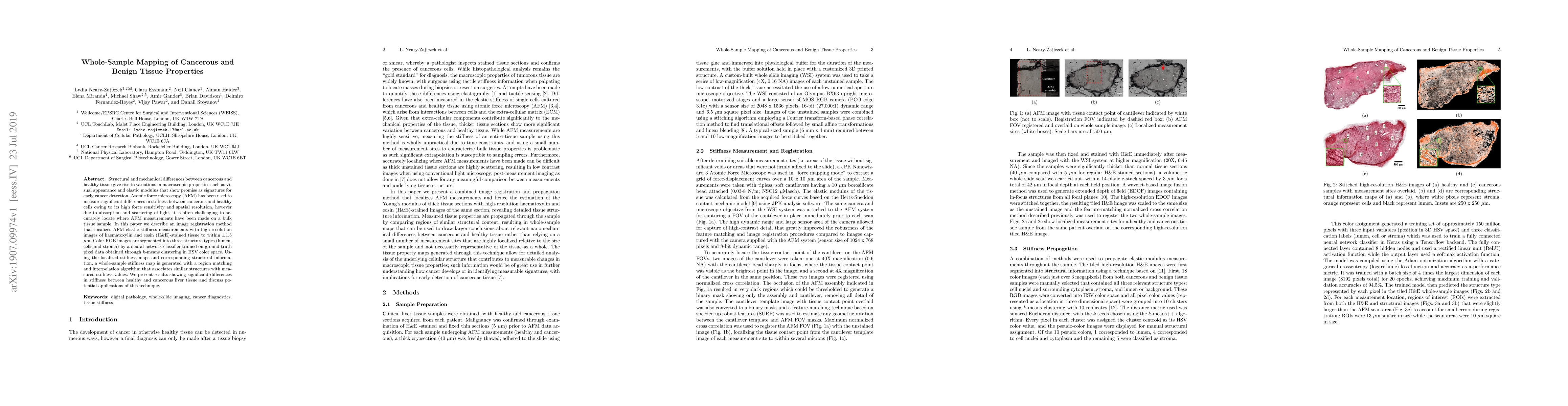 Structural and mechanical differences between cancerous and healthy tissue give rise to variations in macroscopic properties such as visual appearance and elastic modulus that show promise as signatures for early cancer detection. Atomic force microscopy (AFM) has been used to measure significant differences in stiffness between cancerous and healthy cells owing to its high force sensitivity and spatial resolution, however due to absorption and scattering of light, it is often challenging to accurately locate where AFM measurements have been made on a bulk tissue sample. In this paper we describe an image registration method that localizes AFM elastic stiffness measurements with high-resolution images of haematoxylin and eosin (H\&E)-stained tissue to within 1.5 microns. Color RGB images are segmented into three structure types (lumen, cells and stroma) by a neural network classifier trained on ground-truth pixel data obtained through k-means clustering in HSV color space. Using the localized stiffness maps and corresponding structural information, a whole-sample stiffness map is generated with a region matching and interpolation algorithm that associates similar structures with measured stiffness values. We present results showing significant differences in stiffness between healthy and cancerous liver tissue and discuss potential applications of this technique.