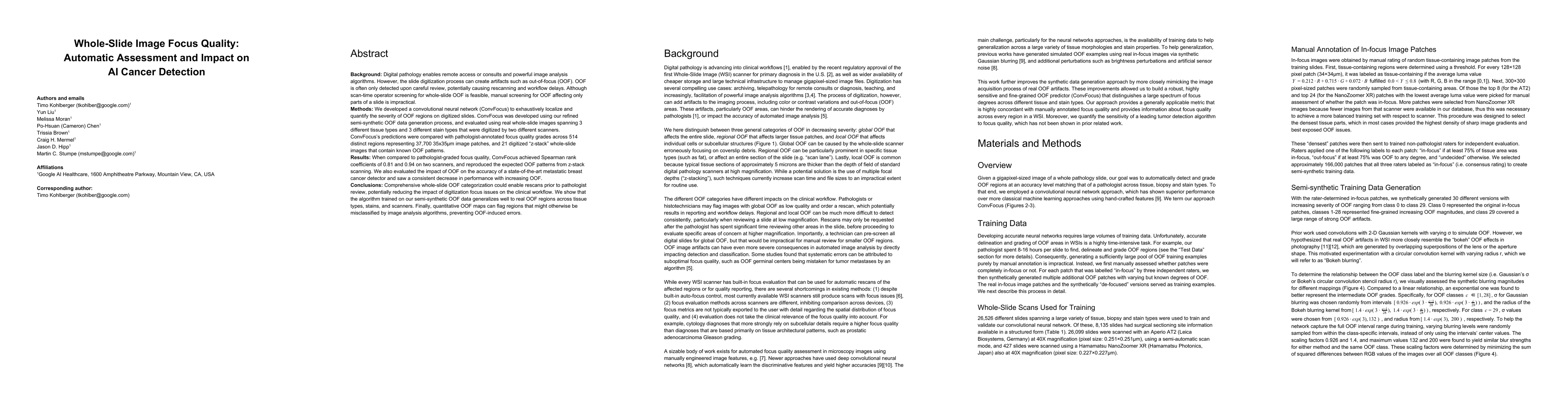 This paper presents a convolutional neural network (ConvFocus) to automatically assess focus quality in whole-slide images, showing its effectiveness in detecting out-of-focus regions and its impact on cancer detection algorithms. The study demonstrates that ConvFocus generalizes well across different tissue types, stains, and scanners, and highlights the potential to reduce workflow delays and improve diagnostic accuracy by identifying problematic regions.