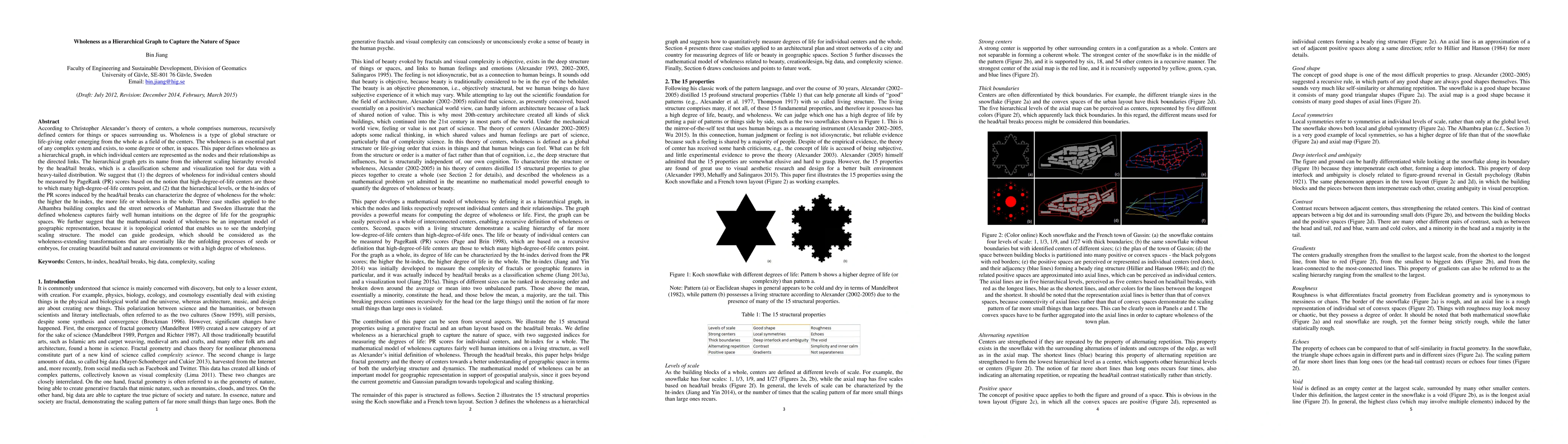 This paper proposes a hierarchical graph model to represent the concept of wholeness in spatial systems, where centers are nodes and their relationships are directed links. The model uses the ht-index of PageRank scores to quantify the degree of wholeness, suggesting that higher ht-index values indicate greater life or wholeness in the system, as demonstrated through case studies of the Alhambra, Manhattan, and Sweden.