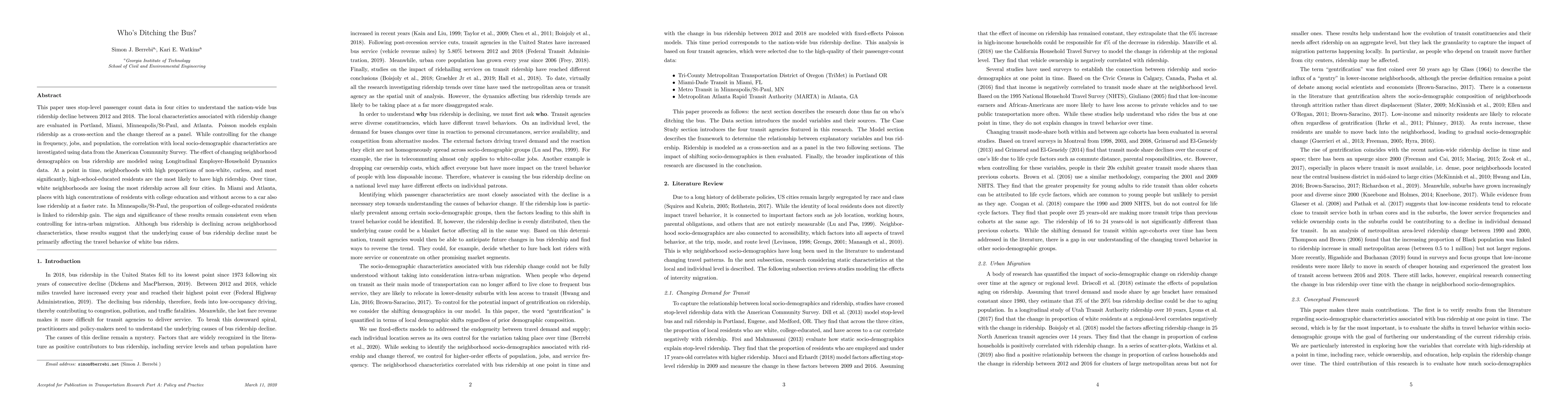 This paper uses stop-level passenger count data in four cities to understand the nation-wide bus ridership decline between 2012 and 2018. The local characteristics associated with ridership change are evaluated in Portland, Miami, Minneapolis/St-Paul, and Atlanta. Poisson models explain ridership as a cross-section and the change thereof as a panel. While controlling for the change in frequency, jobs, and population, the correlation with local socio-demographic characteristics are investigated using data from the American Community Survey. The effect of changing neighborhood demographics on bus ridership are modeled using Longitudinal Employer-Household Dynamics data. At a point in time, neighborhoods with high proportions of non-white, carless, and most significantly, high-school-educated residents are the most likely to have high ridership. Over time, white neighborhoods are losing the most ridership across all four cities. In Miami and Atlanta, places with high concentrations of residents with college education and without access to a car also lose ridership at a faster rate. In Minneapolis/St-Paul, the proportion of college-educated residents is linked to ridership gain. The sign and significance of these results remain consistent even when controlling for intra-urban migration. Although bus ridership is declining across neighborhood characteristics, these results suggest that the underlying cause of bus ridership decline must be primarily affecting the travel behavior of white bus riders.