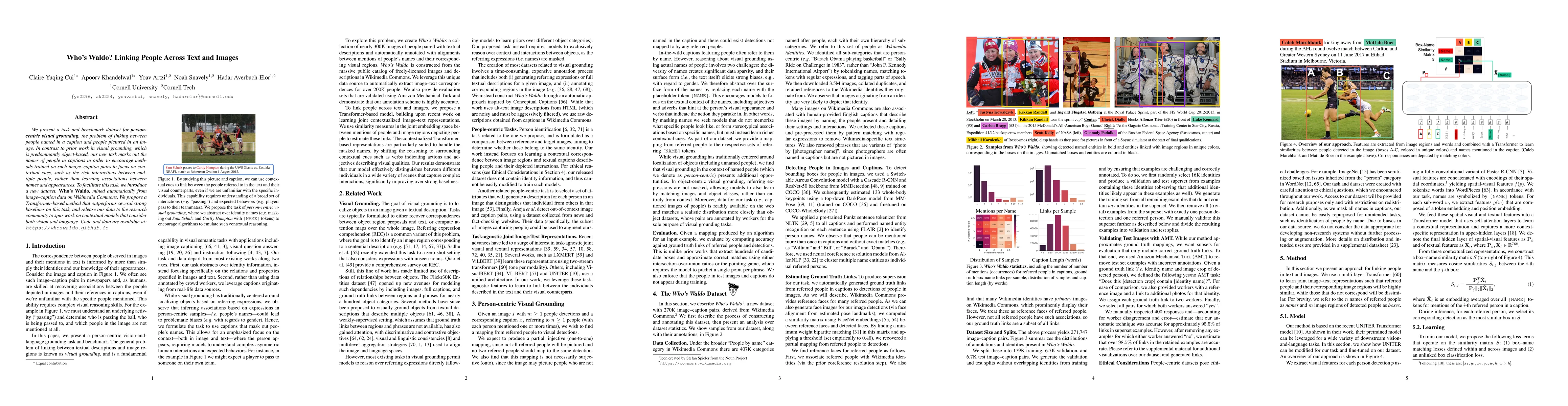 Researchers introduce a new dataset called Who's Waldo to study linking people across text and images, with a focus on contextual cues rather than object-based associations. A Transformer-based method outperforms baselines on this task, enabling the development of more accurate visual grounding models.