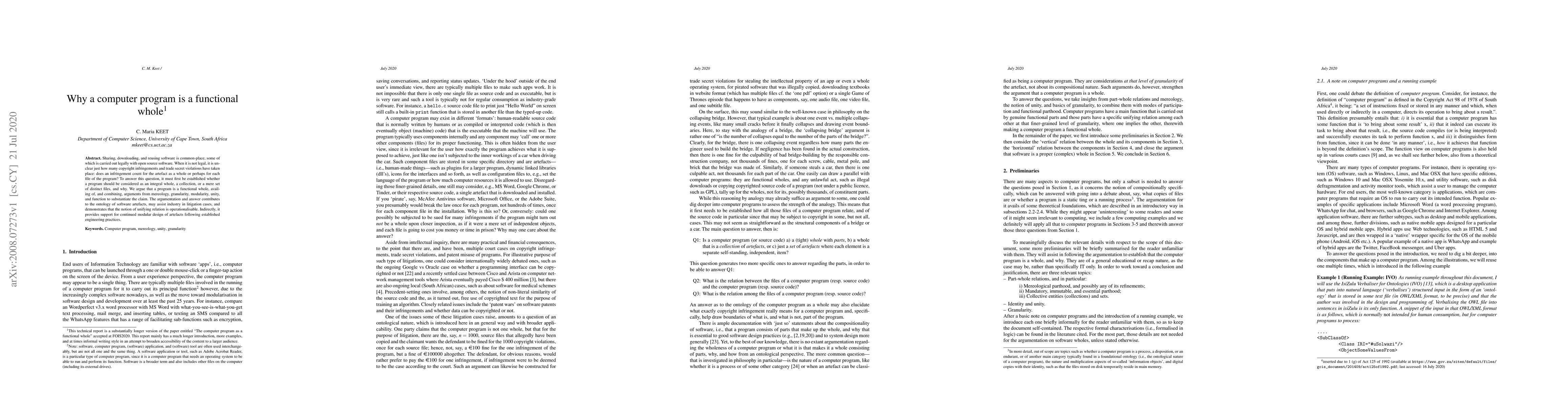 Sharing, downloading, and reusing software is common-place, some of which is carried out legally with open source software. When it is not legal, it is unclear just how many copyright infringements and trade secret violations have taken place: does an infringement count for the artefact as a whole or perhaps for each file of the program? To answer this question, it must first be established whether a program should be considered as an integral whole, a collection, or a mere set of distinct files, and why. We argue that a program is a functional whole, availing of, and combining, arguments from mereology, granularity, modularity, unity, and function to substantiate the claim. The argumentation and answer contributes to the ontology of software artefacts, may assist industry in litigation cases, and demonstrates that the notion of unifying relation is operationalisable. Indirectly, it provides support for continued modular design of artefacts following established engineering practices.