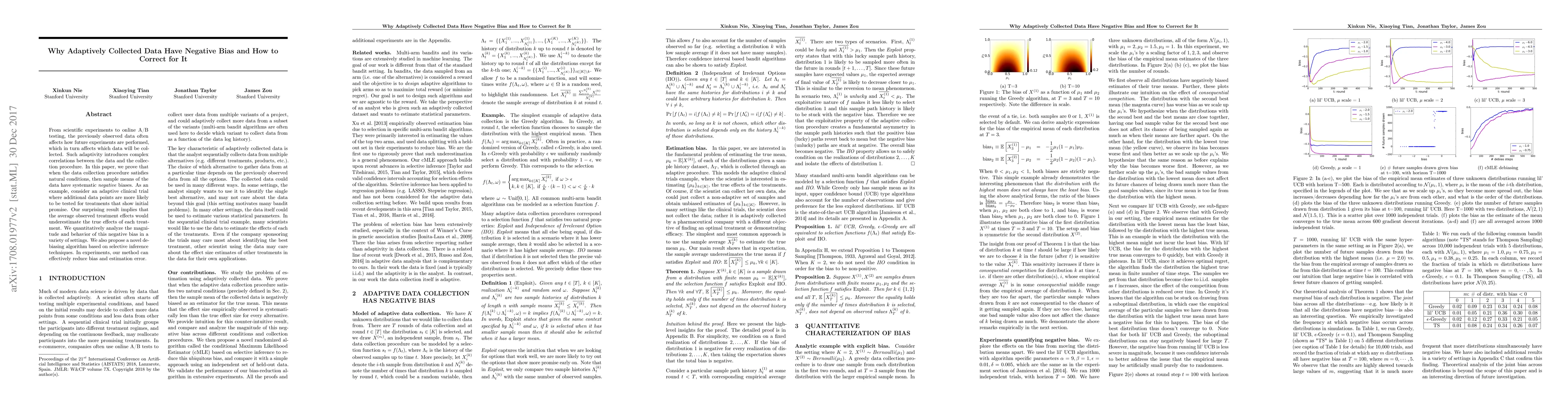 This paper demonstrates that adaptively collected data often exhibit systematic negative biases due to the influence of previous observations on future data collection. It proposes a novel debiasing algorithm to correct for this bias, showing effective reduction in bias and estimation error in experiments.