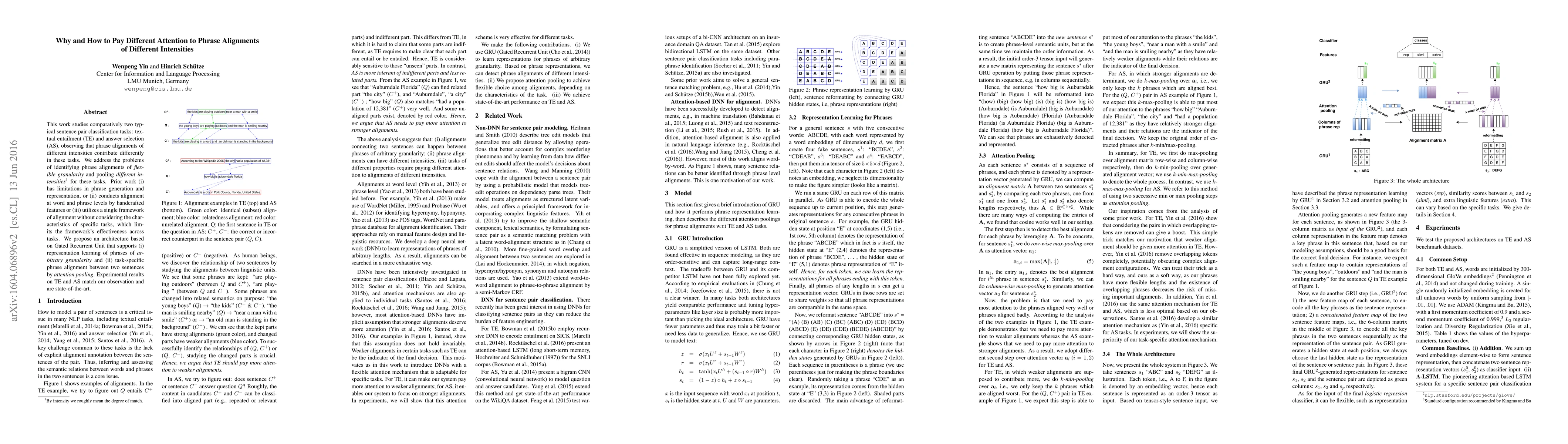 This paper proposes an architecture based on Gated Recurrent Units to address the varying importance of different phrase alignments in textual entailment and answer selection tasks, achieving state-of-the-art results by focusing on flexible granularity and task-specific attention pooling.