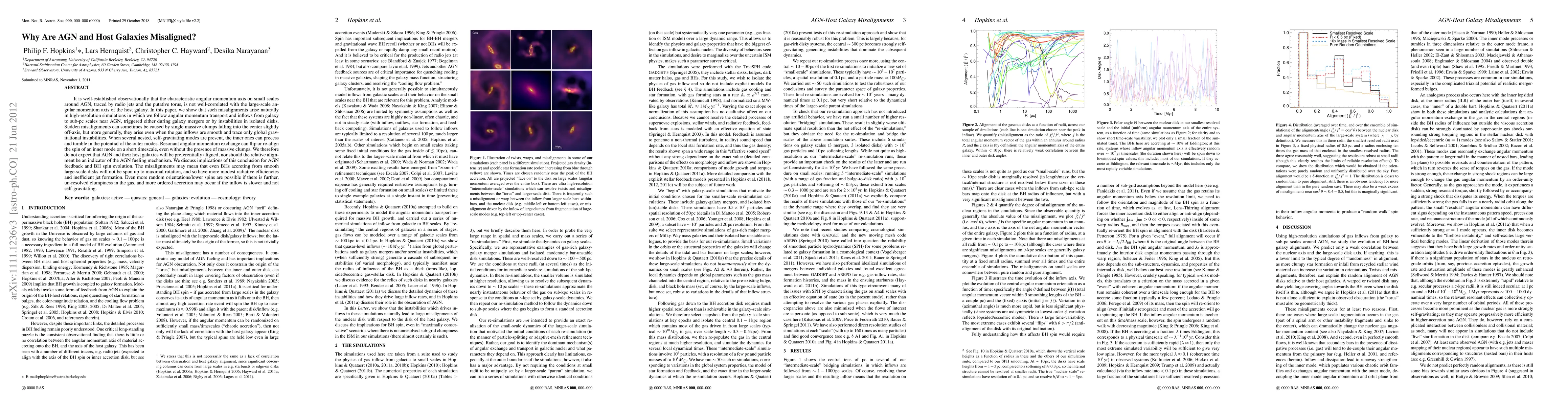It is well-established observationally that the characteristic angular momentum axis on small scales around AGN, traced by radio jets and the putative torus, is not well-correlated with the large-scale angular momentum axis of the host galaxy. In this paper, we show that such misalignments arise naturally in high-resolution simulations in which we follow angular momentum transport and inflows from galaxy to sub-pc scales near AGN, triggered either during galaxy mergers or by instabilities in isolated disks. Sudden misalignments can sometimes be caused by single massive clumps falling into the center slightly off-axis, but more generally, they arise even when the gas inflows are smooth and trace only global gravitational instabilities. When several nested, self-gravitating modes are present, the inner ones can precess and tumble in the potential of the outer modes. Resonant angular momentum exchange can flip or re-align the spin of an inner mode on a short timescale, even without the presence of massive clumps. We therefore do not expect that AGN and their host galaxies will be preferentially aligned, nor should the relative alignment be an indicator of the AGN fueling mechanism. We discuss implications of this conclusion for AGN feedback and BH spin evolution. The misalignments may mean that even BHs accreting from smooth large-scale disks will not be spun up to maximal rotation, and so have more modest radiative efficiencies and inefficient jet formation. Even more random orientations are possible if there is further, un-resolved clumpiness in the gas, and more ordered accretion may occur if the inflow is slower and not self-gravitating.