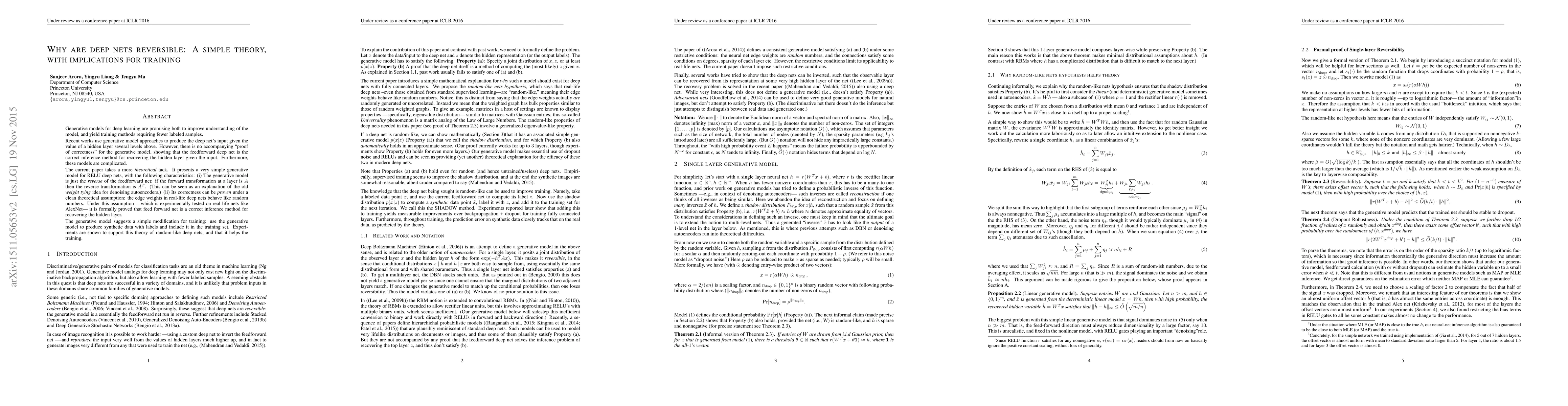 This paper proposes a simple generative model for RELU deep nets, demonstrating that the reverse transformation is the transpose of the forward transformation, and proves its correctness under the assumption that real-life deep net weights behave like random numbers. It suggests using this generative model to create synthetic labeled data for training, which experiments show improves training efficiency.