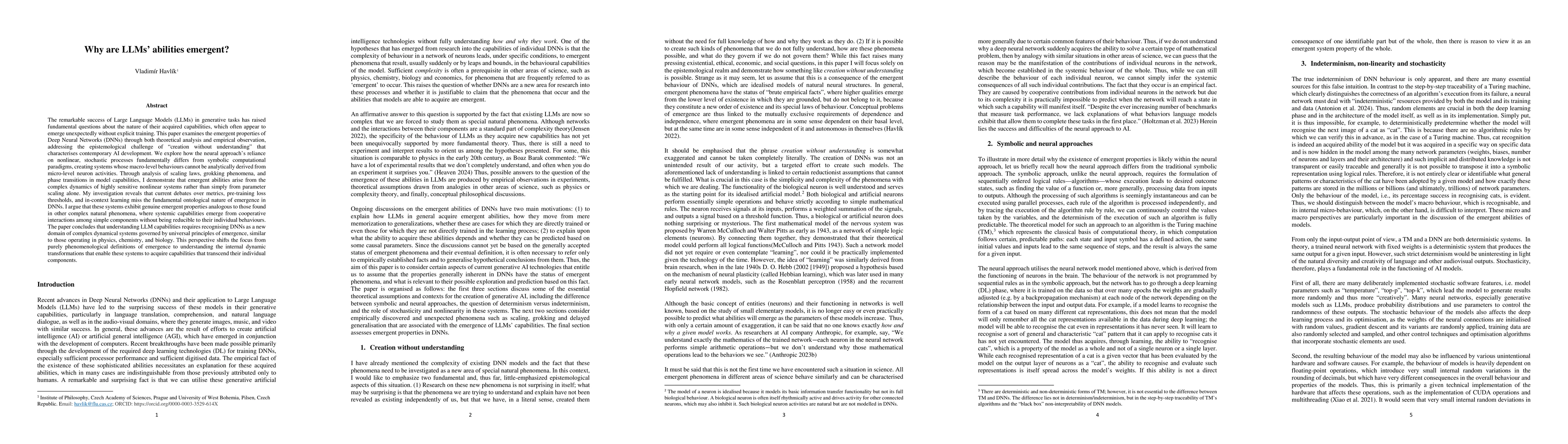 The remarkable success of Large Language Models (LLMs) in generative tasks has raised fundamental questions about the nature of their acquired capabilities, which often appear to emerge unexpectedly without explicit training. This paper examines the emergent properties of Deep Neural Networks (DNNs) through both theoretical analysis and empirical observation, addressing the epistemological challenge of "creation without understanding" that characterises contemporary AI development. We explore how the neural approach's reliance on nonlinear, stochastic processes fundamentally differs from symbolic computational paradigms, creating systems whose macro-level behaviours cannot be analytically derived from micro-level neuron activities. Through analysis of scaling laws, grokking phenomena, and phase transitions in model capabilities, I demonstrate that emergent abilities arise from the complex dynamics of highly sensitive nonlinear systems rather than simply from parameter scaling alone. My investigation reveals that current debates over metrics, pre-training loss thresholds, and in-context learning miss the fundamental ontological nature of emergence in DNNs. I argue that these systems exhibit genuine emergent properties analogous to those found in other complex natural phenomena, where systemic capabilities emerge from cooperative interactions among simple components without being reducible to their individual behaviours. The paper concludes that understanding LLM capabilities requires recognising DNNs as a new domain of complex dynamical systems governed by universal principles of emergence, similar to those operating in physics, chemistry, and biology. This perspective shifts the focus from purely phenomenological definitions of emergence to understanding the internal dynamic transformations that enable these systems to acquire capabilities that transcend their individual components.