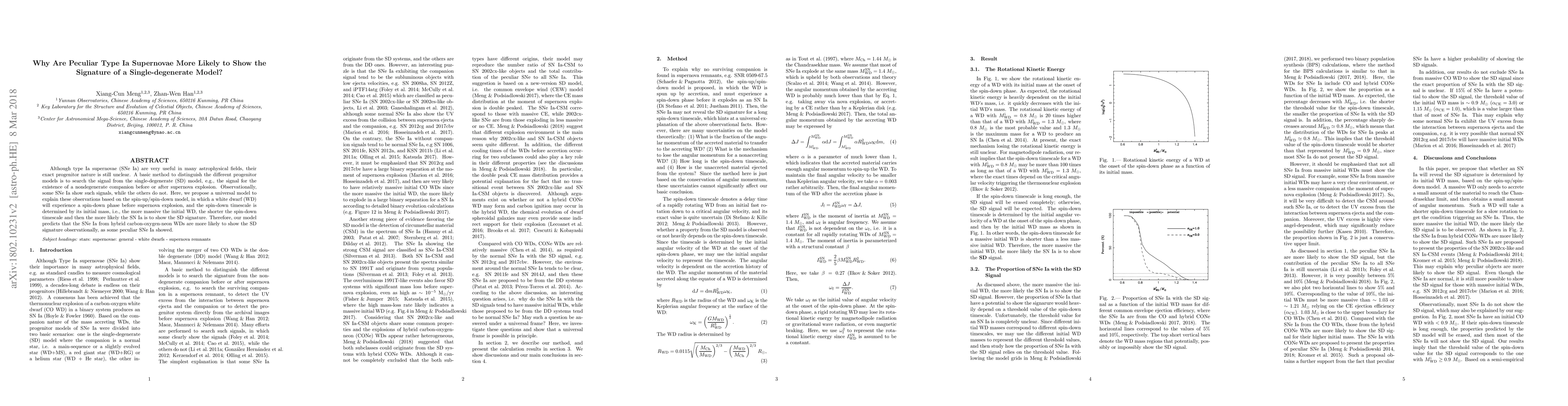 Although type Ia supernovae (SNe Ia) are very useful in many astrophysical fields, their exact progenitor nature is still unclear. A basic method to distinguish the different progenitor models is to search the signal from the single degenerate (SD) model, e.g. the signal for the existence of a non-degenerate companion before or after supernova explosion. Observationally, some SNe Ia show such signal, while the others do not. Here, we propose a universal model to explain these observations based on the spin-up/spin-down model, in which a white dwarf (WD) will experience a spin-down phase before supernova explosion, and the spin-down timescale is determined by its initial mass, i.e. the more massive the initial WD, the shorter the spin-down timescale and then the more likely the SN Ia to show the SD signature. Therefore, our model predicts that the SNe Ia from hybrid carbon-oxygen-neon WDs are more likely to show the SD signature observationally, as some peculiar SNe Ia showed.