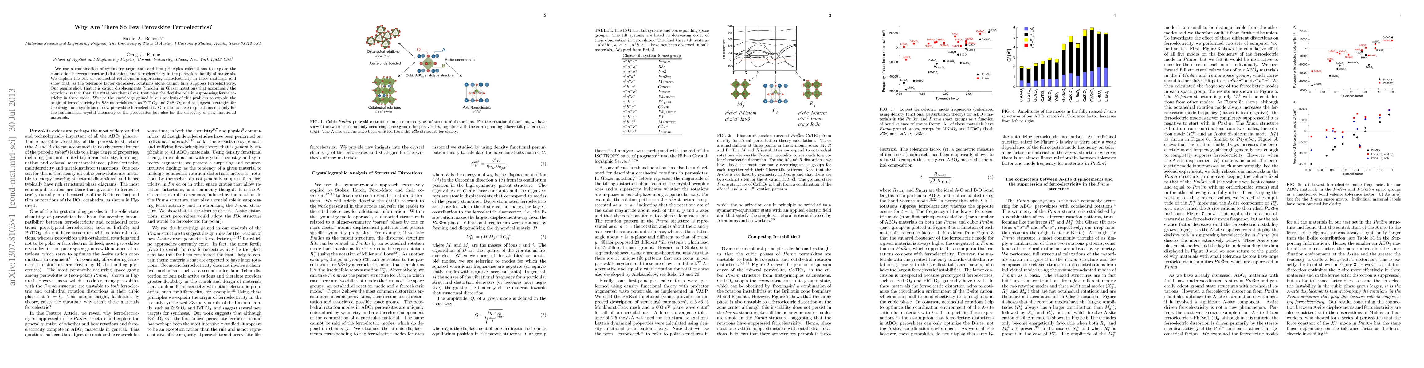 We use a combination of symmetry arguments and first-principles calculations to explore the connection between structural distortions and ferroelectricity in the perovskite family of materials. We explain the role of octahedral rotations in suppressing ferroelectricity in these materials and show that, as the tolerance factor decreases, rotations alone cannot fully suppress ferroelectricity. Our results show that it is cation displacements (`hidden' in Glazer notation) that accompany the rotations, rather than the rotations themselves, that play the decisive role in suppressing ferroelectricity in these cases. We use the knowledge gained in our analysis of this problem to explain the origin of ferroelectricity in $R3c$ materials such as FeTiO$_3$ and ZnSnO$_3$ and to suggest strategies for the design and synthesis of new perovskite ferroelectrics. Our results have implications not only for the fundamental crystal chemistry of the perovskites but also for the discovery of new functional materials.