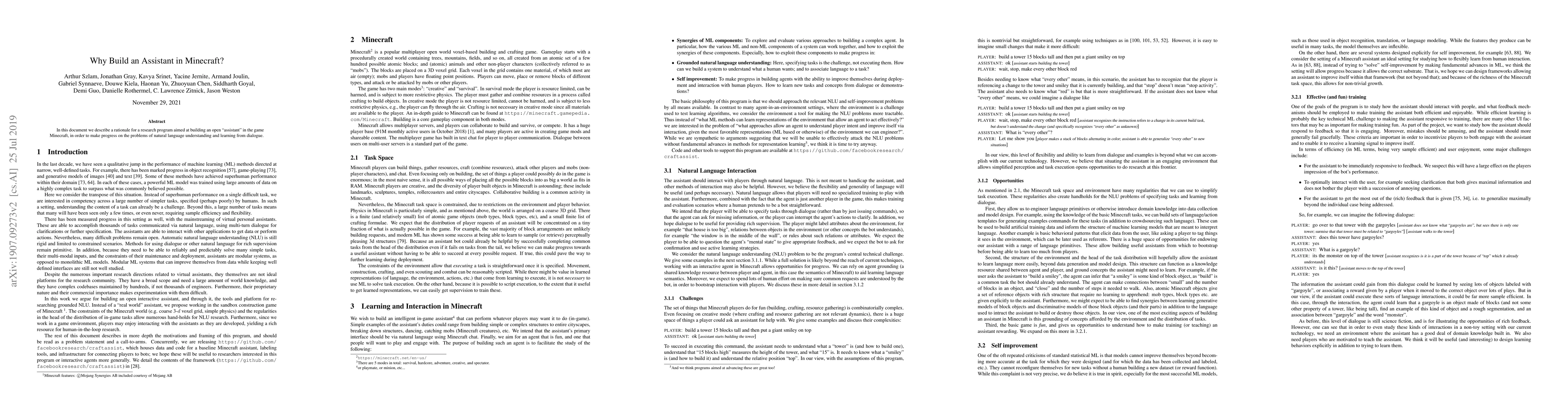 This research paper proposes building an assistant in Minecraft to advance natural language understanding and learning from dialogue. By leveraging the game's interactive nature, the project aims to create a platform for exploring complex AI concepts.