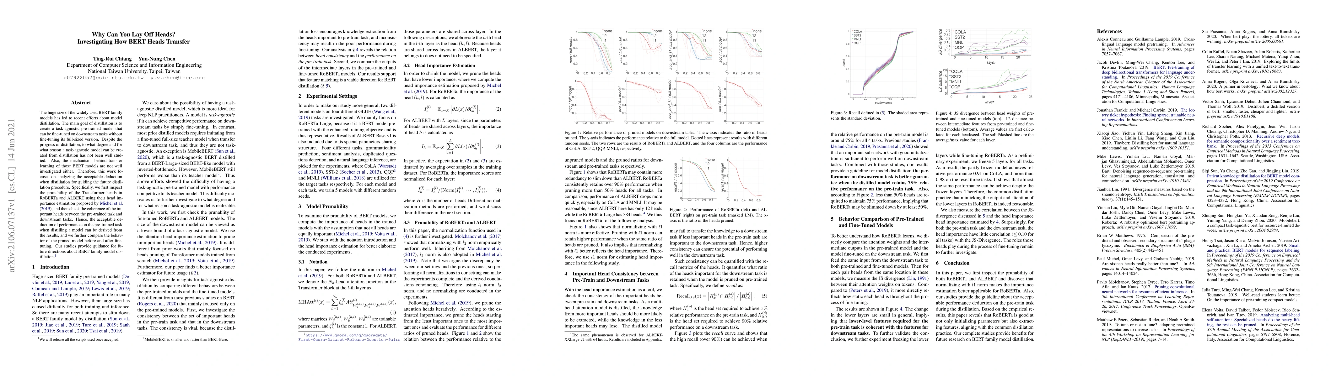 The huge size of the widely used BERT family models has led to recent efforts about model distillation. The main goal of distillation is to create a task-agnostic pre-trained model that can be fine-tuned on downstream tasks without fine-tuning its full-sized version. Despite the progress of distillation, to what degree and for what reason a task-agnostic model can be created from distillation has not been well studied. Also, the mechanisms behind transfer learning of those BERT models are not well investigated either. Therefore, this work focuses on analyzing the acceptable deduction when distillation for guiding the future distillation procedure. Specifically, we first inspect the prunability of the Transformer heads in RoBERTa and ALBERT using their head importance estimation proposed by Michel et al. (2019), and then check the coherence of the important heads between the pre-trained task and downstream tasks. Hence, the acceptable deduction of performance on the pre-trained task when distilling a model can be derived from the results, and we further compare the behavior of the pruned model before and after fine-tuning. Our studies provide guidance for future directions about BERT family model distillation.