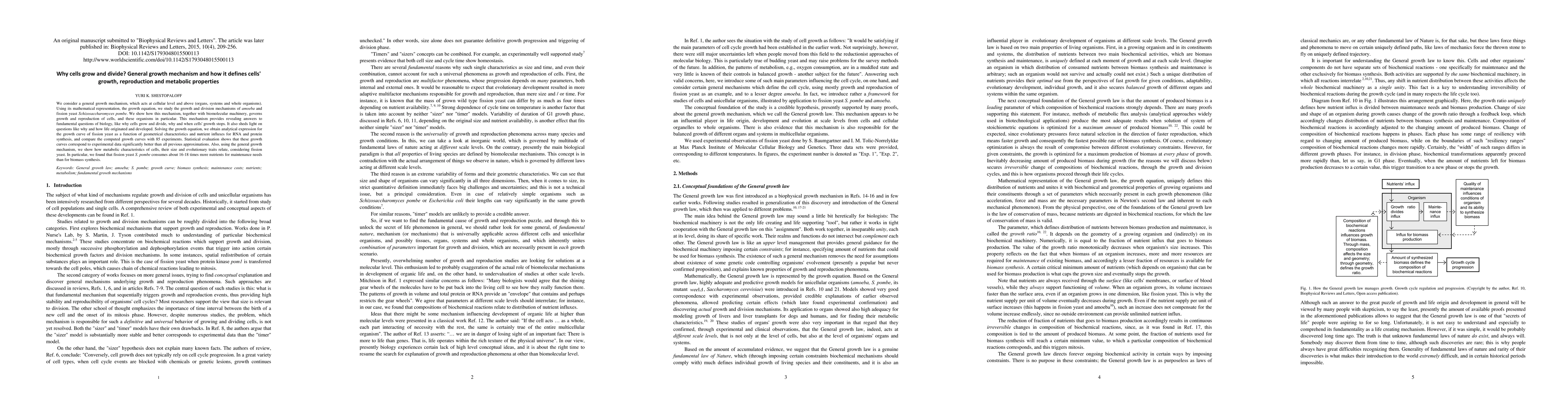 We consider a general growth mechanism, which acts at cellular level and above (organs, systems and whole organisms). Using its mathematical representation, the growth equation, we study the growth and division mechanisms of amoeba and fission yeast Schizosaccharomyces pombe. We show how this mechanism, together with biomolecular machinery, governs growth and reproduction of cells, and these organisms in particular. This mechanism provides revealing answers to fundamental questions of biology, like why cells grow and divide, why and when cells' growth stops. It also sheds light on questions like why and how life originated and developed. Solving the growth equation, we obtain analytical expression for the growth curve of fission yeast as a function of geometrical characteristics and nutrient influxes for RNA and protein synthesis, and compare the computed growth curves with 85 experiments. Statistical evaluation shows that these growth curves correspond to experimental data significantly better than all previous approximations. Also, using the general growth mechanism, we show how metabolic characteristics of cells, their size and evolutionary traits relate, considering fission yeast. In particular, we found that fission yeast S. pombe consumes about 16-18 times more nutrients for maintenance needs than for biomass synthesis.