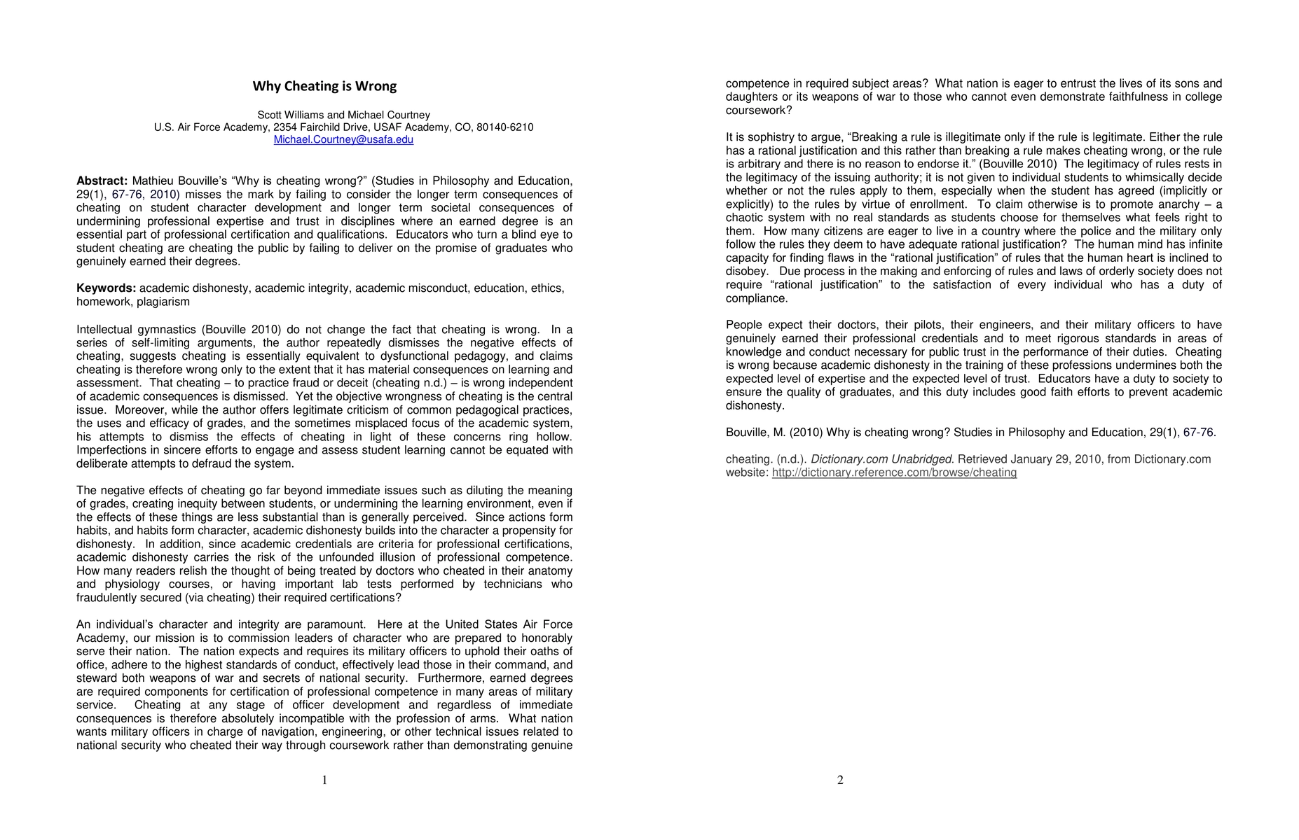 Mathieu Bouville's "Why is cheating wrong?" (Studies in Philosophy and Education, 29(1), 67-76, 2010) misses the mark by failing to consider the longer term consequences of cheating on student character development and longer term societal consequences of undermining professional expertise and trust in disciplines where an earned degree is an essential part of professional certification and qualifications. Educators who turn a blind eye to student cheating are cheating the public by failing to deliver on the promise of graduates who genuinely earned their degrees.