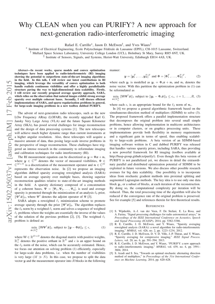 In recent works, sparse models and convex optimization techniques have been applied to radio-interferometric (RI) imaging showing the potential to outperform state-of-the-art imaging algorithms in the field. In this talk, I will review our latest contributions in RI imaging, which leverage the versatility of convex optimization to both handle realistic continuous visibilities and offer a highly parallelizable structure paving the way to high-dimensional data scalability. Firstly, I will review our recently proposed average sparsity approach, SARA, which relies on the observation that natural images exhibit strong average sparsity over multiple coherent bases. Secondly, I will discuss efficient implementations of SARA, and sparse regularization problems in general, for large-scale imaging problems in a new toolbox dubbed