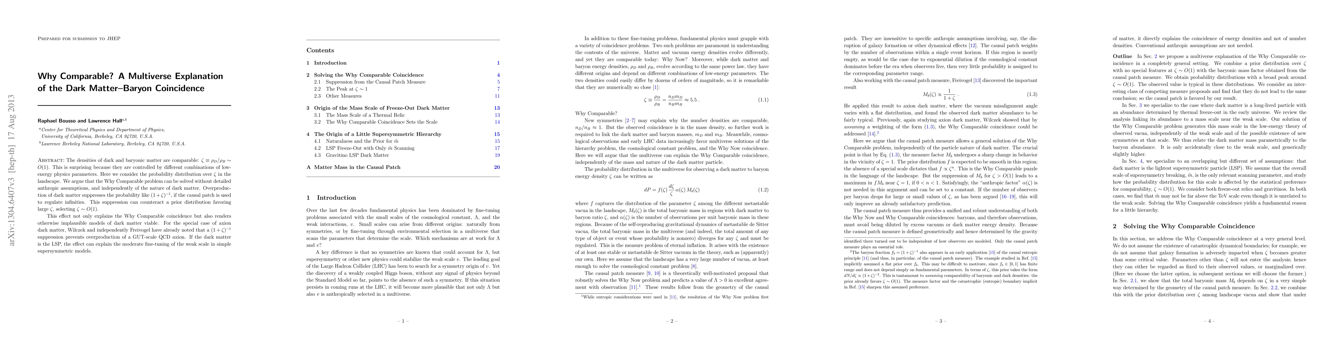 The densities of dark and baryonic matter are comparable: \zeta = \rho_D / \rho_B ~ O(1). This is surprising because they are controlled by different combinations of low-energy physics parameters. Here we consider the probability distribution over \zeta in the landscape. We argue that the Why Comparable problem can be solved without detailed anthropic assumptions, and independently of the nature of dark matter. Overproduction of dark matter suppresses the probability like 1/(1+\zeta), if the causal patch is used to regulate infinities. This suppression can counteract a prior distribution favoring large \zeta, selecting \zeta ~ O(1). This effect not only explains the Why Comparable coincidence but also renders otherwise implausible models of dark matter viable. For the special case of axion dark matter, Wilczek and independently Freivogel have already noted that a 1/(1+\zeta) suppression prevents overproduction of a GUT-scale QCD axion. If the dark matter is the LSP, the effect can explain the moderate fine-tuning of the weak scale in simple supersymmetric models.