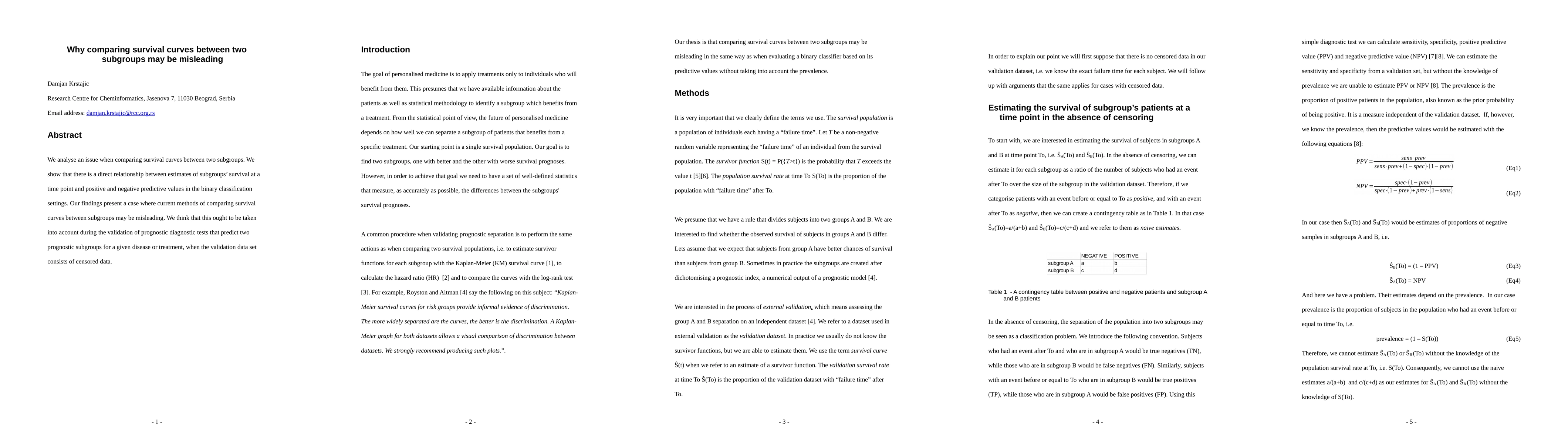 We analyse an issue when comparing survival curves between two subgroups. We show that there is a direct relationship between estimates of subgroups' survival at a time point and positive and negative predictive values in the binary classification settings. Our findings present a case where current methods of comparing survival curves between subgroups may be misleading. We think that this ought to be taken into account during the validation of prognostic diagnostic tests that predict two prognostic subgroups for a given disease or treatment, when the validation data set consists of censored data.