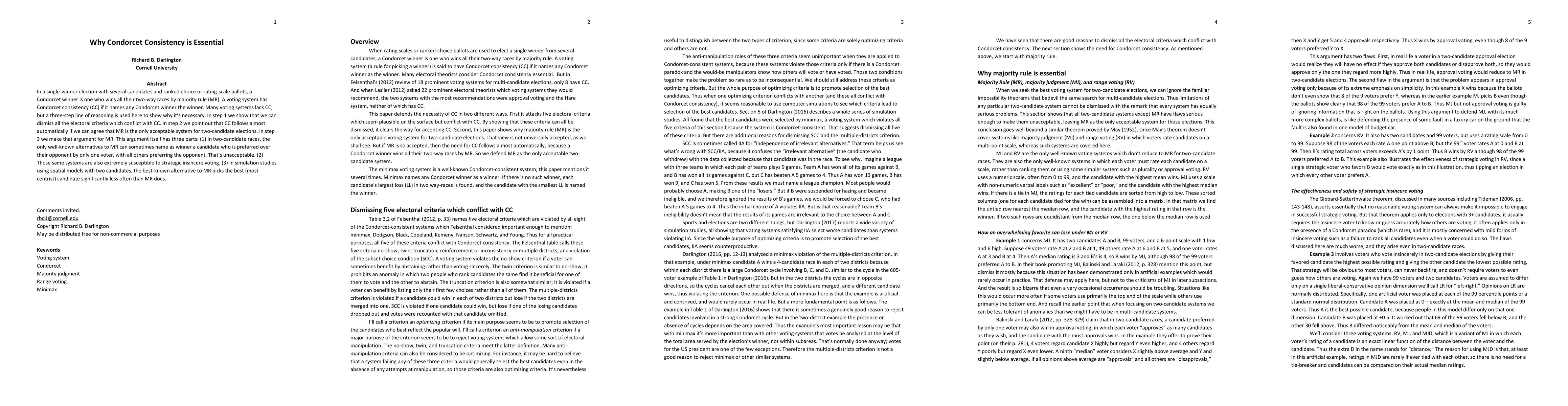 In a single winner election with several candidates and ranked choice or rating scale ballots, a Condorcet winner is one who wins all their two way races by majority rule or MR. A voting system has Condorcet consistency or CC if it names any Condorcet winner the winner. Many voting systems lack CC, but a three step line of reasoning is used here to show why it is necessary. In step 1 we show that we can dismiss all the electoral criteria which conflict with CC. In step 2 we point out that CC follows almost automatically if we can agree that MR is the only acceptable system for elections with two candidates. In step 3 we make that argument for MR. This argument itself has three parts. First, in races with two candidates, the only well known alternatives to MR can sometimes name as winner a candidate who is preferred over their opponent by only one voter, with all others preferring the opponent. That is unacceptable. Second, those same systems are also extremely susceptible to strategic insincere voting. Third, in simulation studies using spatial models with two candidates, the best known alternative to MR picks the best or most centrist candidate significantly less often than MR does.