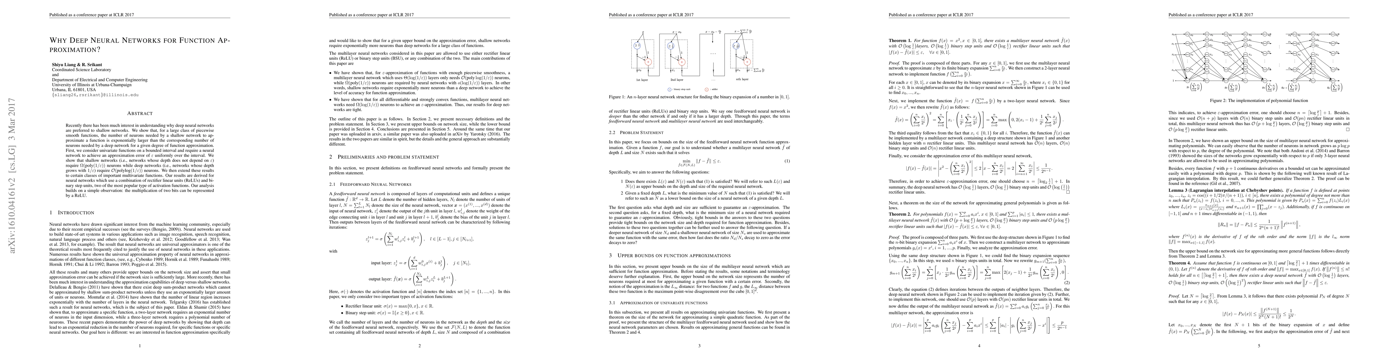 Recently there has been much interest in understanding why deep neural networks are preferred to shallow networks. We show that, for a large class of piecewise smooth functions, the number of neurons needed by a shallow network to approximate a function is exponentially larger than the corresponding number of neurons needed by a deep network for a given degree of function approximation. First, we consider univariate functions on a bounded interval and require a neural network to achieve an approximation error of $\varepsilon$ uniformly over the interval. We show that shallow networks (i.e., networks whose depth does not depend on $\varepsilon$) require $\Omega(\text{poly}(1/\varepsilon))$ neurons while deep networks (i.e., networks whose depth grows with $1/\varepsilon$) require $\mathcal{O}(\text{polylog}(1/\varepsilon))$ neurons. We then extend these results to certain classes of important multivariate functions. Our results are derived for neural networks which use a combination of rectifier linear units (ReLUs) and binary step units, two of the most popular type of activation functions. Our analysis builds on a simple observation: the multiplication of two bits can be represented by a ReLU.