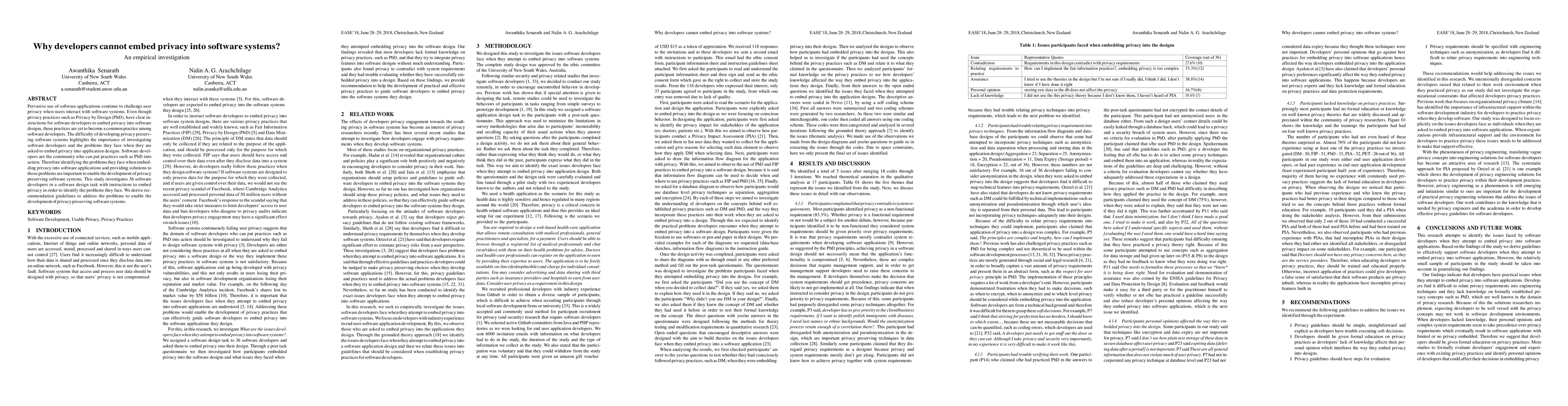 Pervasive use of software applications continues to challenge user privacy when users interact with software systems. Even though privacy practices such as Privacy by Design (PbD), have clear in- structions for software developers to embed privacy into software designs, those practices are yet to become a common practice among software developers. The difficulty of developing privacy preserv- ing software systems highlights the importance of investigating software developers and the problems they face when they are asked to embed privacy into application designs. Software devel- opers are the community who can put practices such as PbD into action. Therefore, identifying problems they face when embed- ding privacy into software applications and providing solutions to those problems are important to enable the development of privacy preserving software systems. This study investigates 36 software developers in a software design task with instructions to embed privacy in order to identify the problems they face. We derive rec- ommendation guidelines to address the problems to enable the development of privacy preserving software systems.