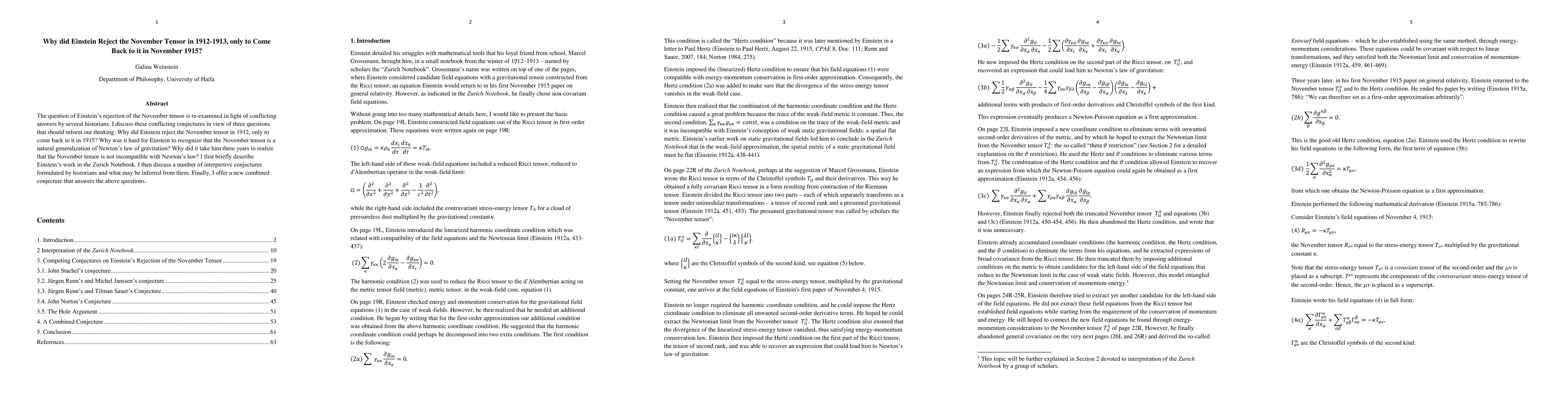 The question of Einstein's rejection of the November tensor is re-examined in light of conflicting answers by several historians. I discuss these conflicting conjectures in view of three questions that should inform our thinking: Why did Einstein reject the November tensor in 1912, only to come back to it in 1915? Why was it hard for Einstein to recognize that the November tensor is a natural generalization of Newton's law of gravitation? Why did it take him three years to realize that the November tensor is not incompatible with Newton's law? I first briefly describe Einstein's work in the Zurich Notebook. I then discuss a number of interpretive conjectures formulated by historians and what may be inferred from them. Finally, I offer a new combined conjecture that answers the above questions.